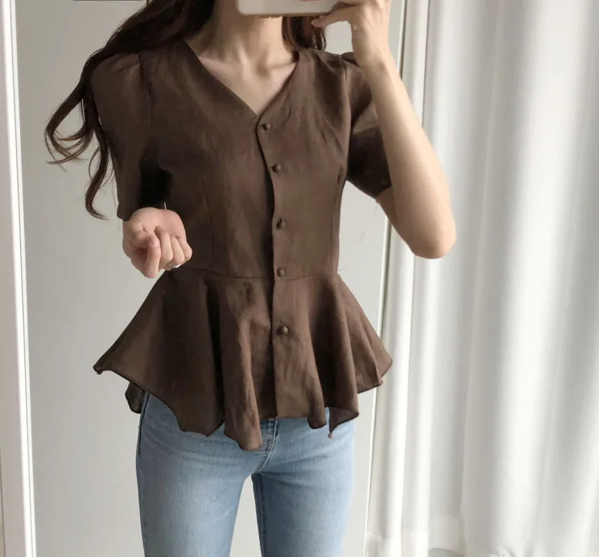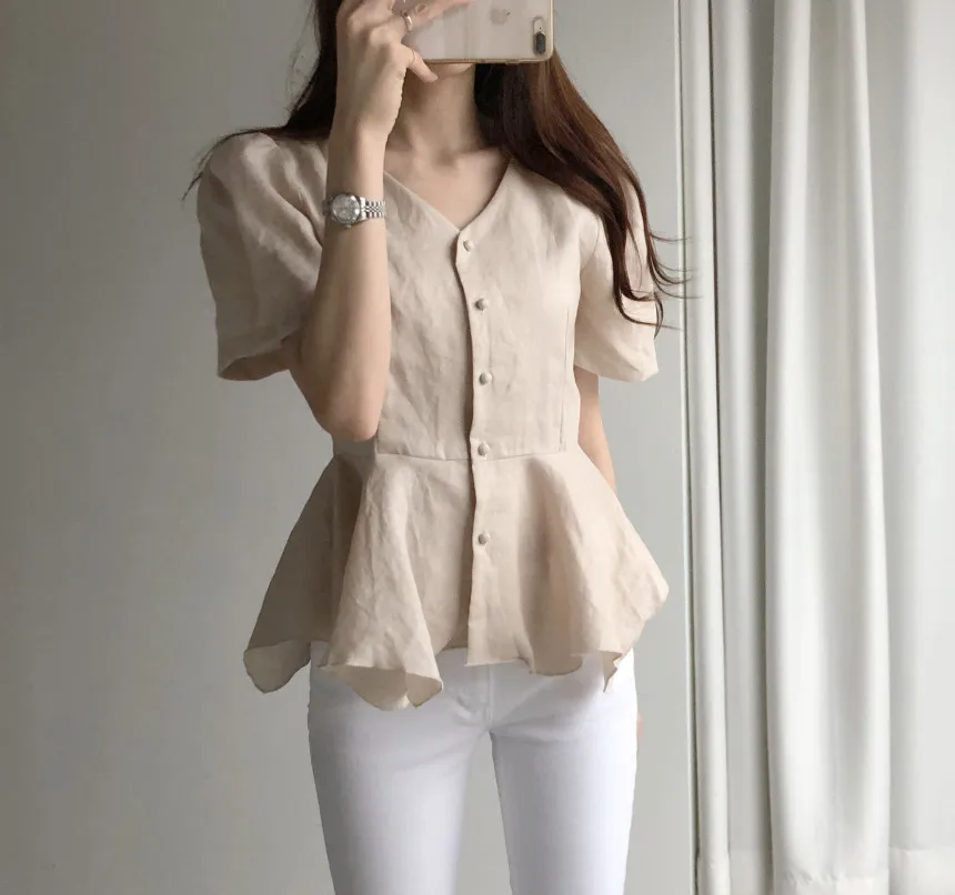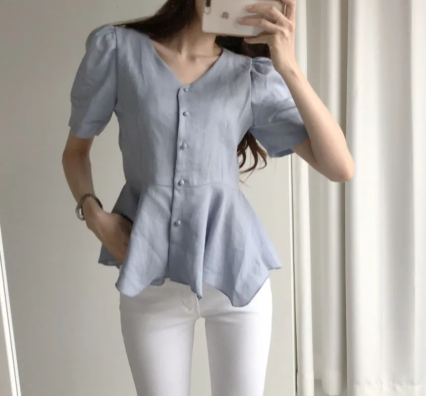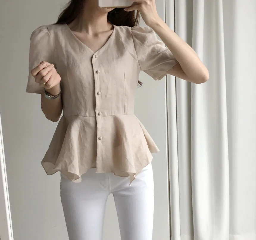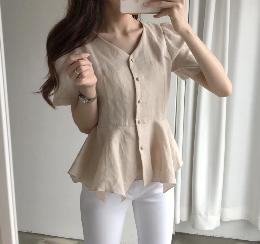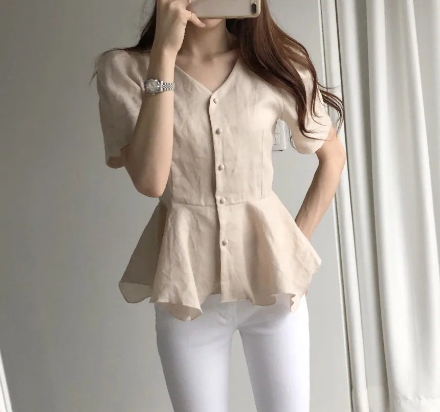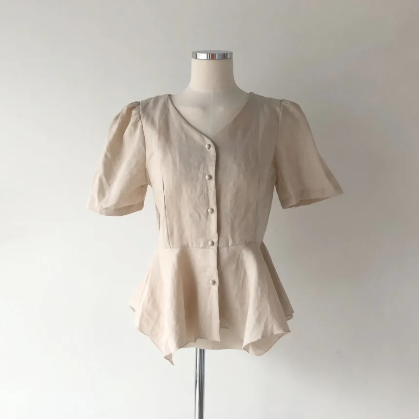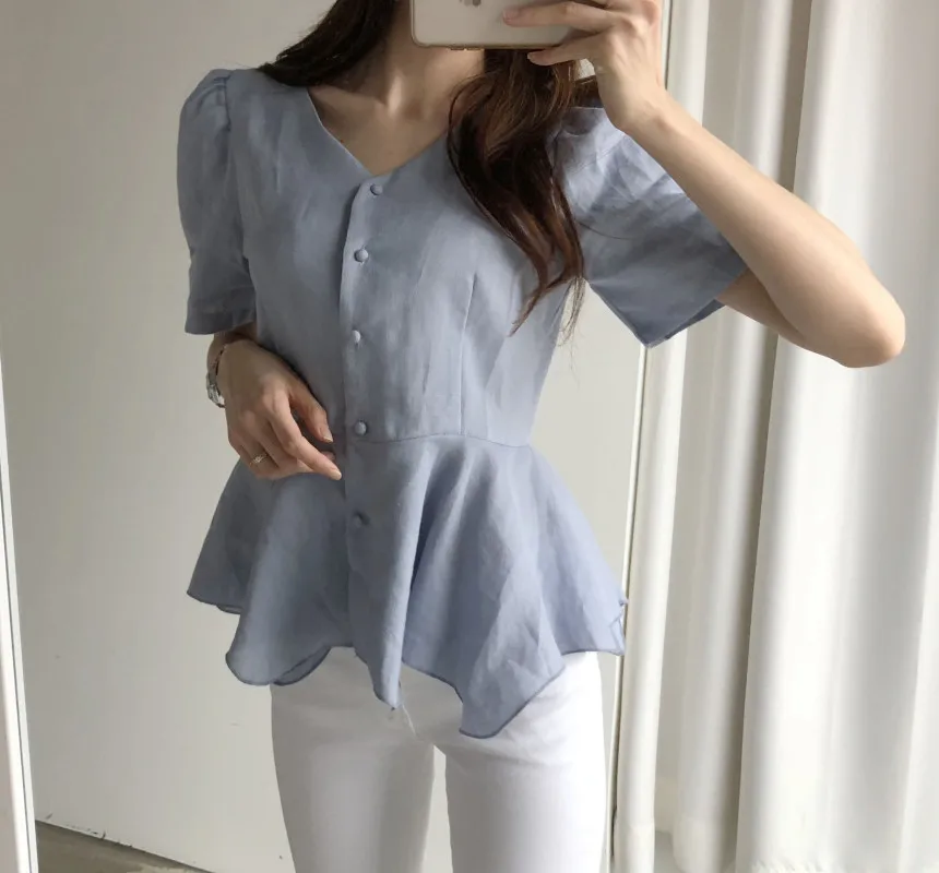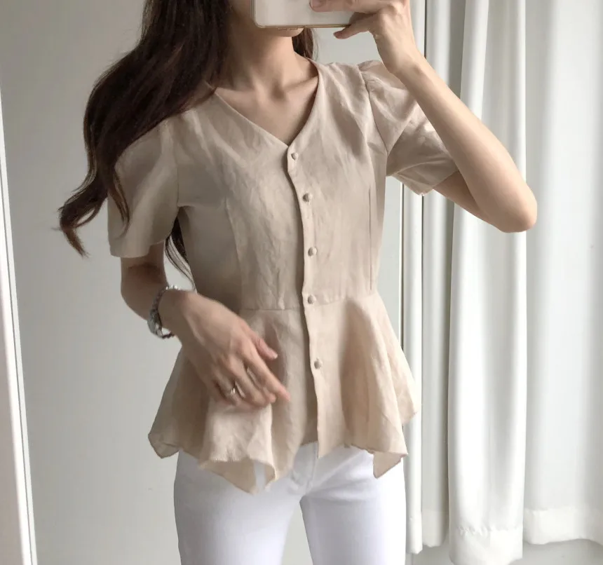 Women Blouses Office Lady Cotton Cotton And Linen Tops 2021 Summer Korean Fashion Slim V-neck Irregular Hem Shirts