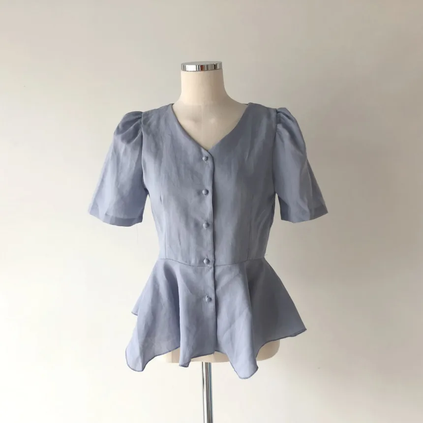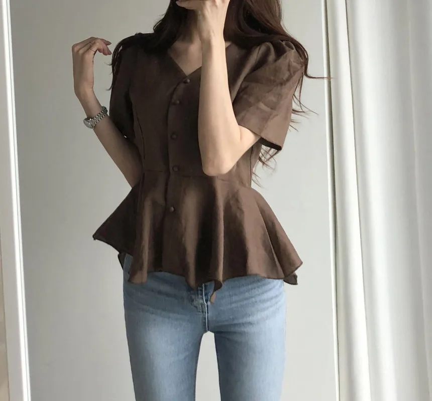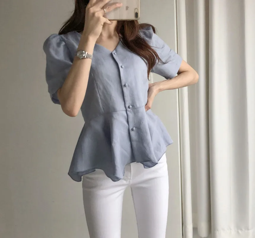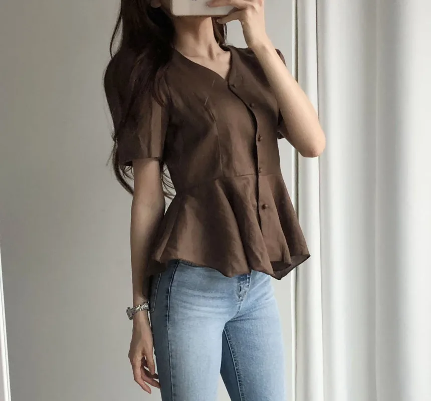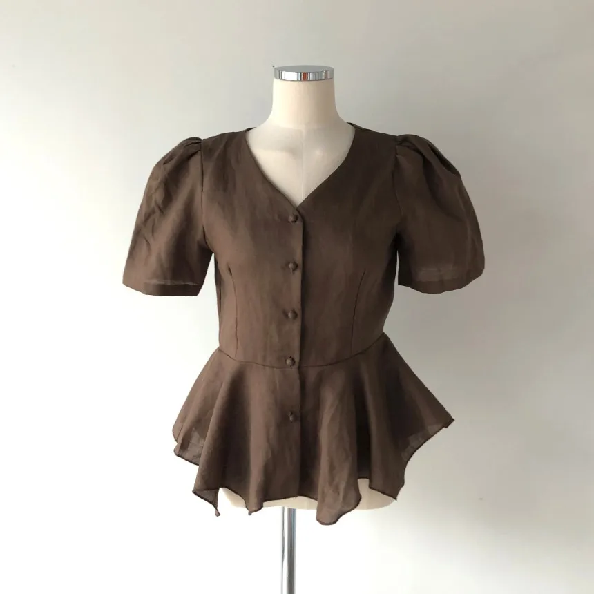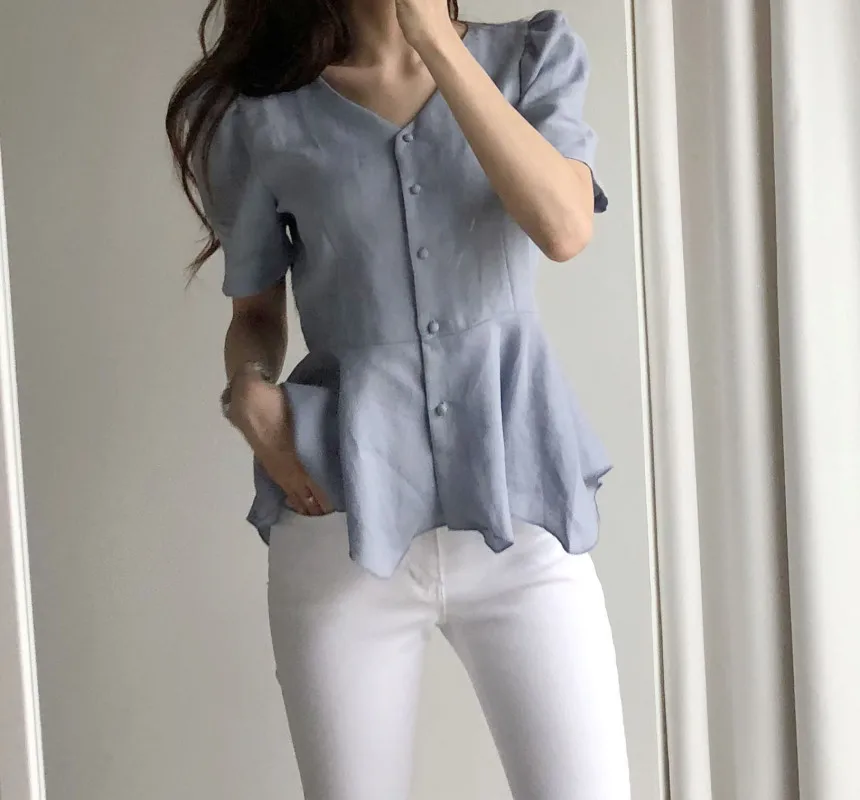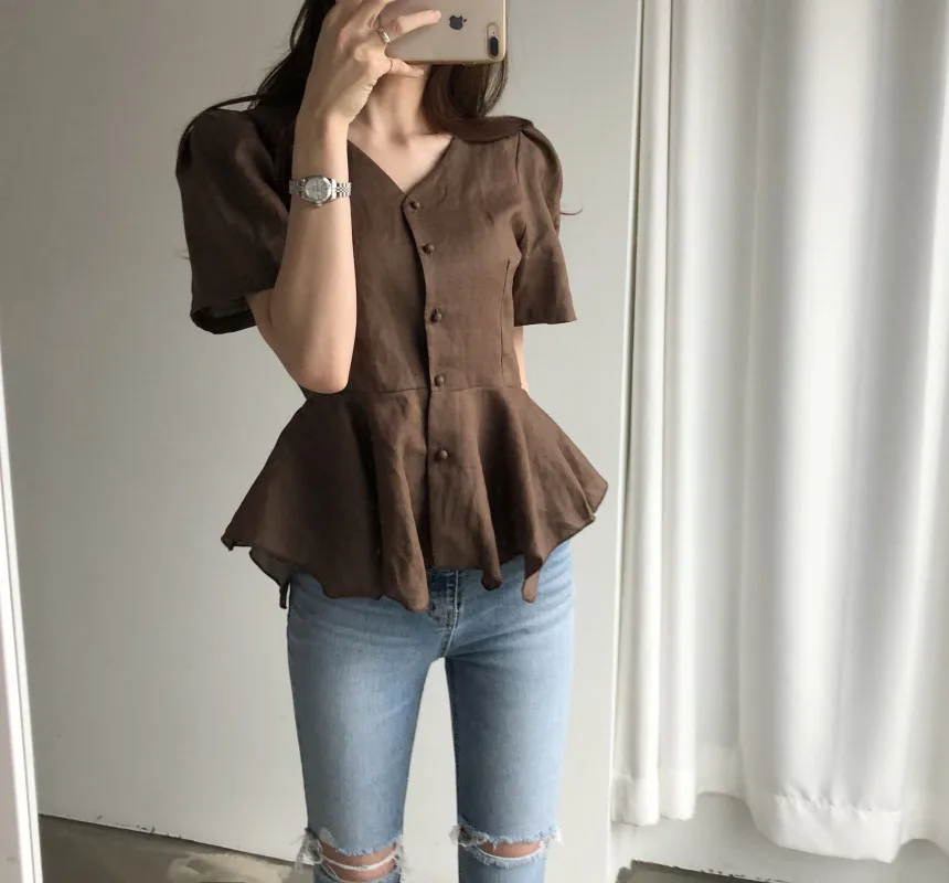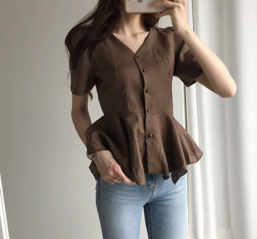 Women Blouses Office Lady Cotton Cotton And Linen Tops 2021 Summer Korean Fashion Slim V-neck Irregular Hem Shirts