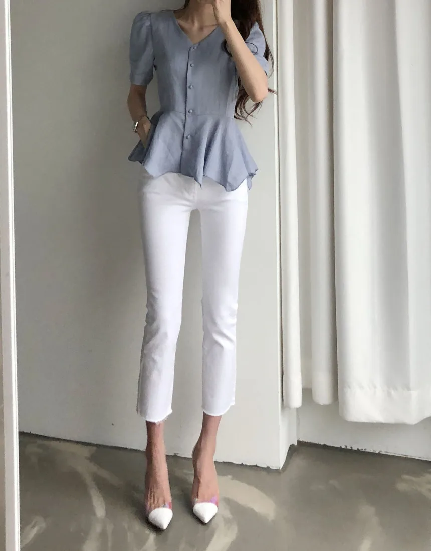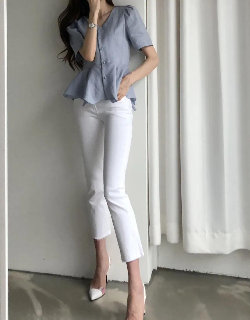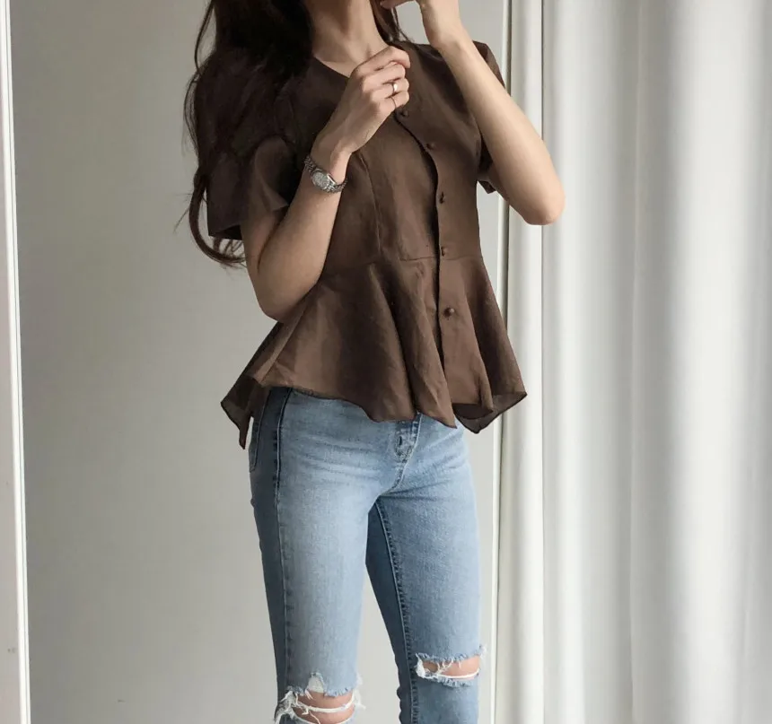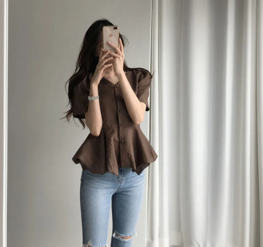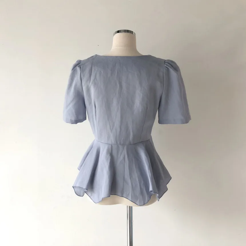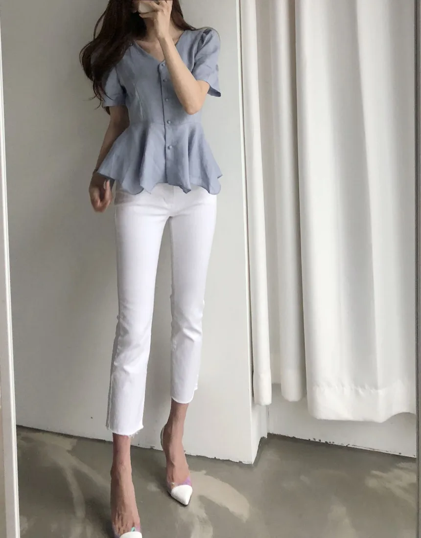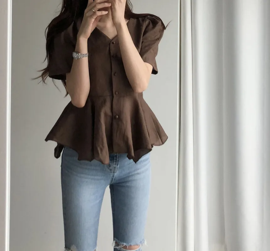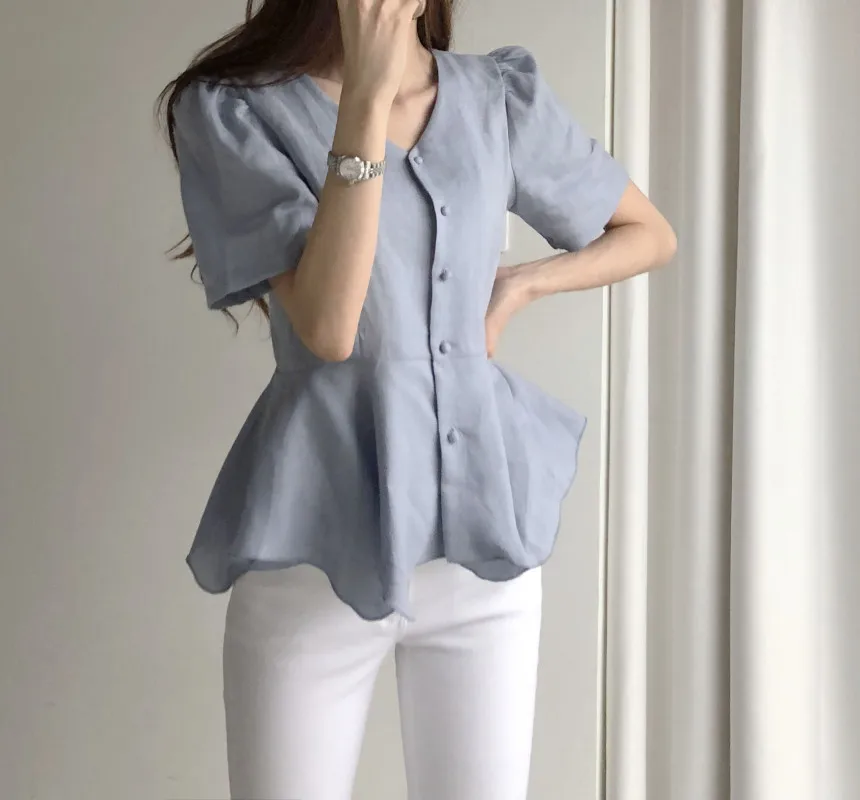 Women Blouses Office Lady Cotton Cotton And Linen Tops 2021 Summer Korean Fashion Slim V-neck Irregular Hem Shirts