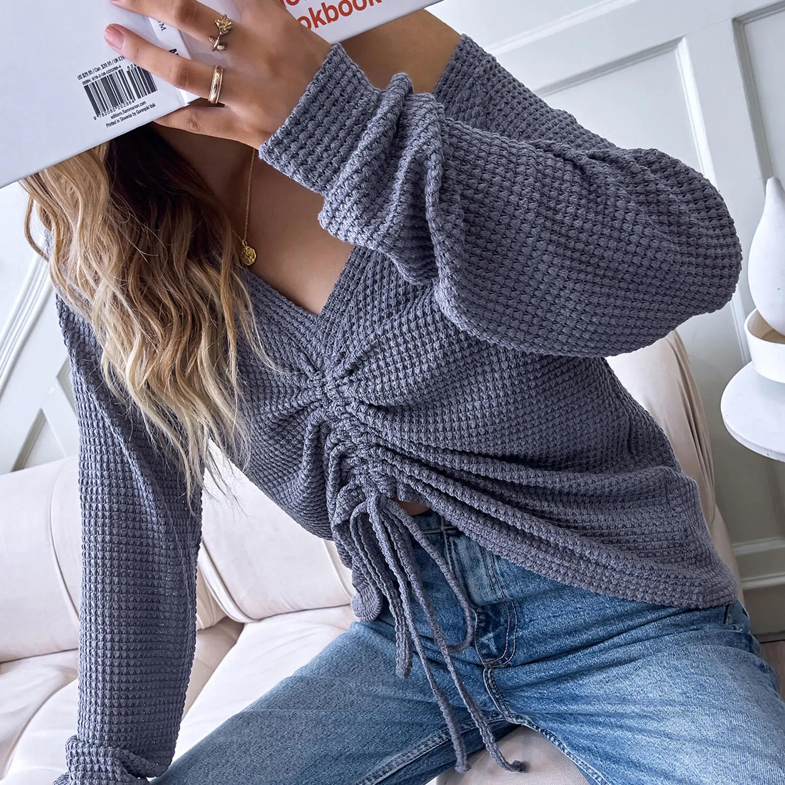 Loose pullover with V neck and raglan long sleeve for autumn and spring. The drawstring design at the front shows ruched detailing and allows you to adjust the length to have a cropped style. Have it to pair jeans for streets.