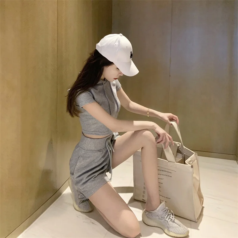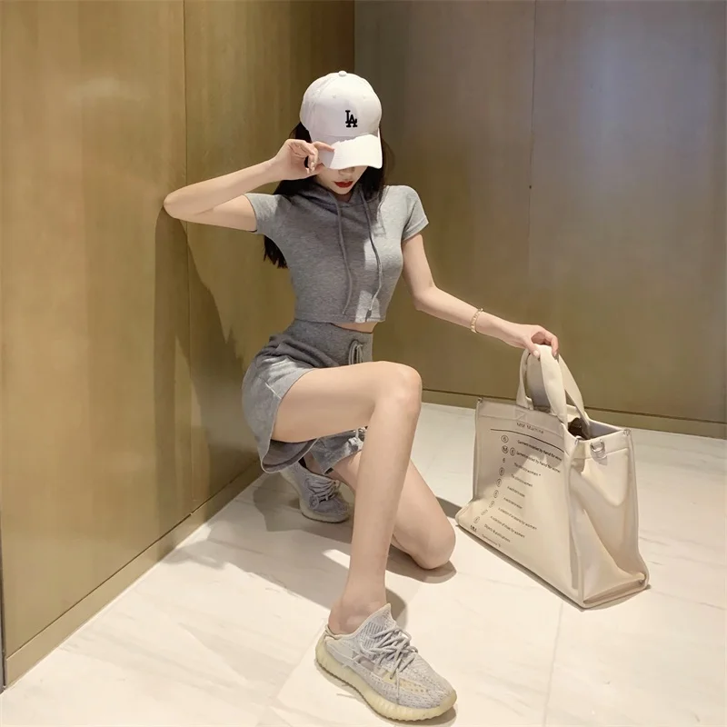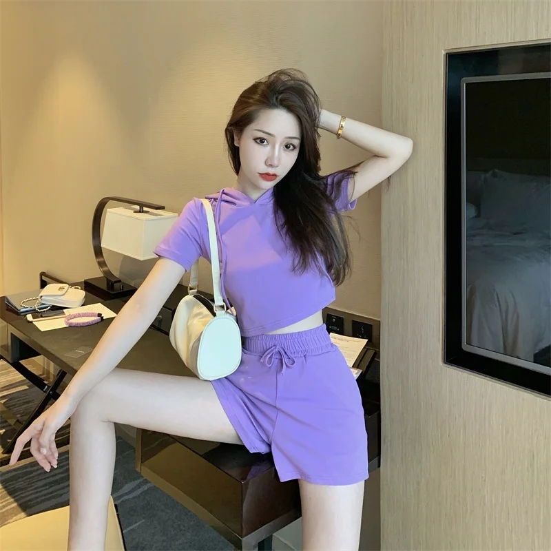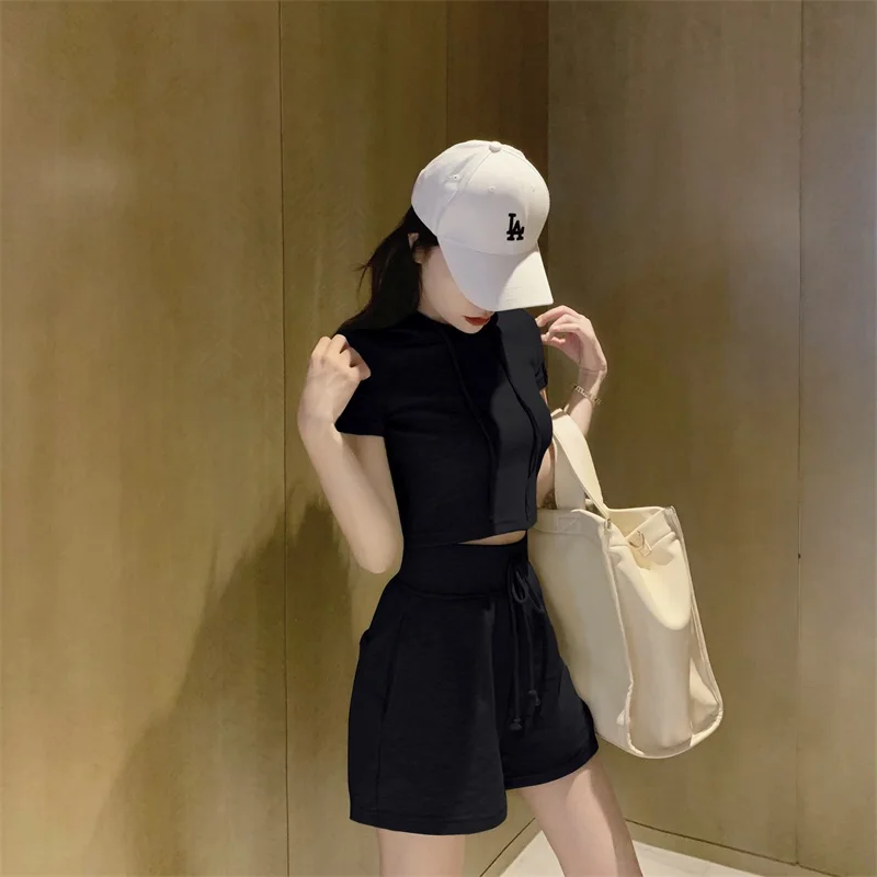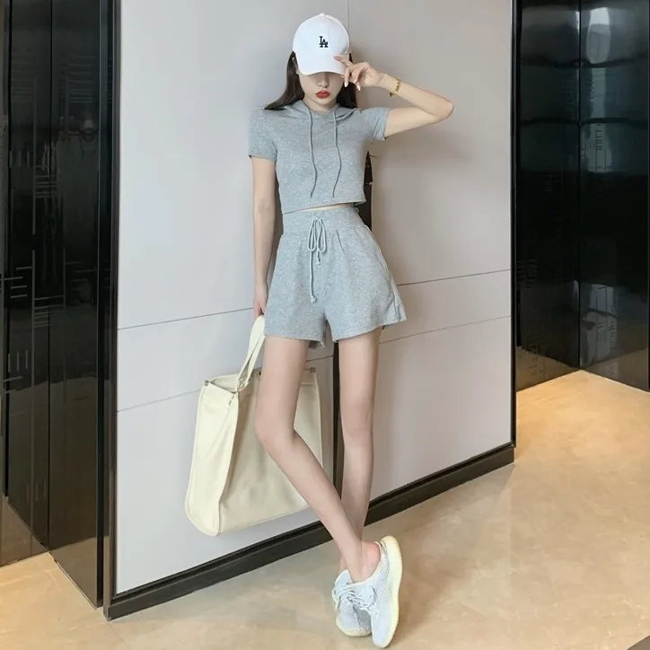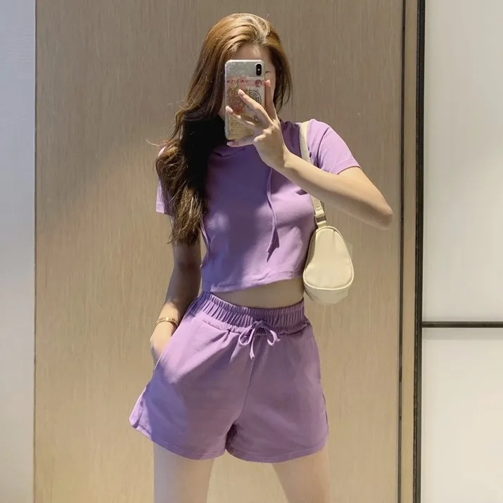 Women Sets Solid Hooded Short Sleeve T-shirts Pockets Drawstring Shorts Running All-match Elegant Korean Style Summer 2 Pieces