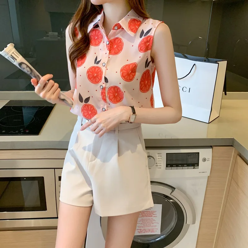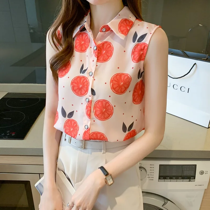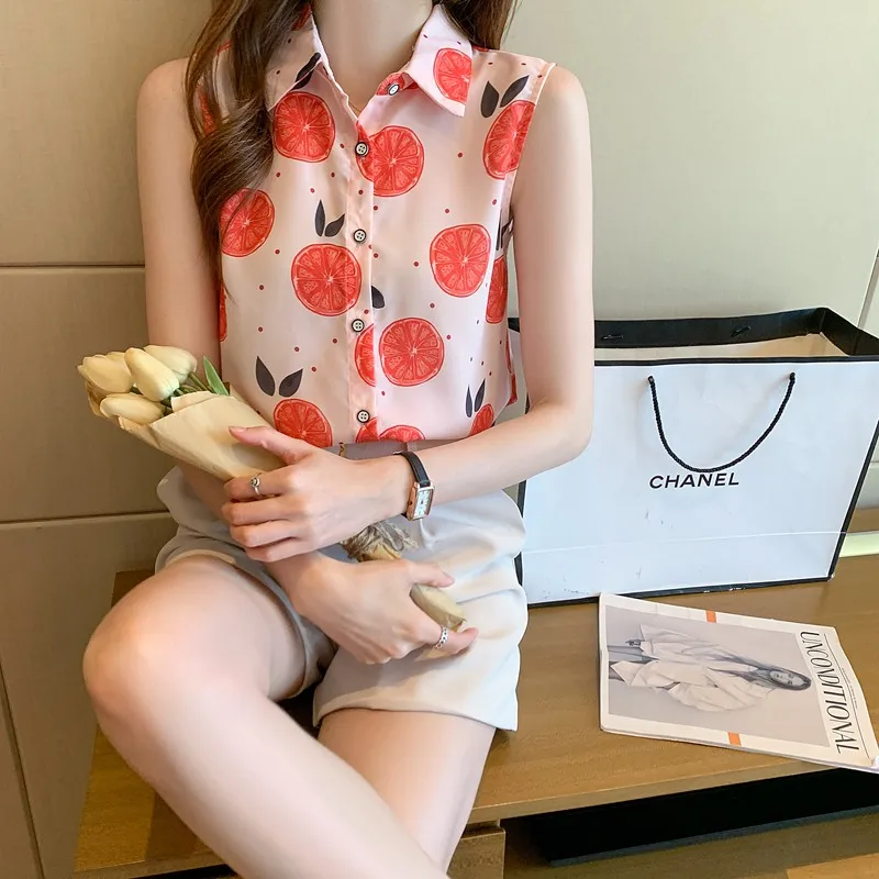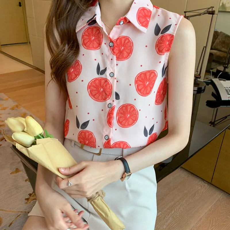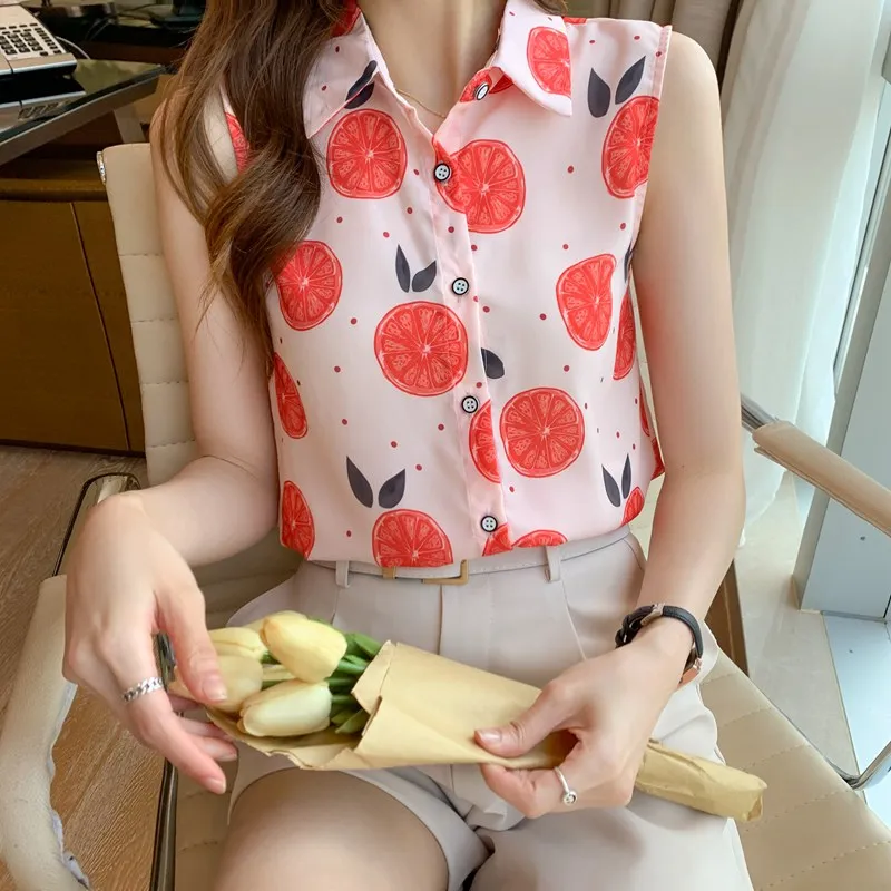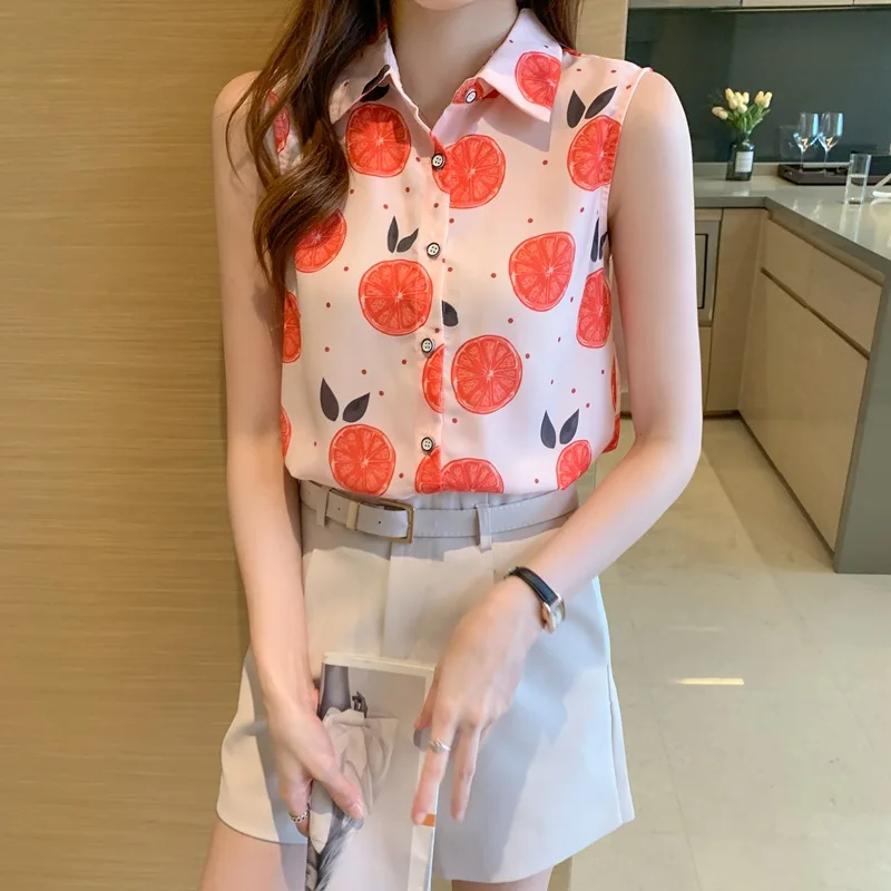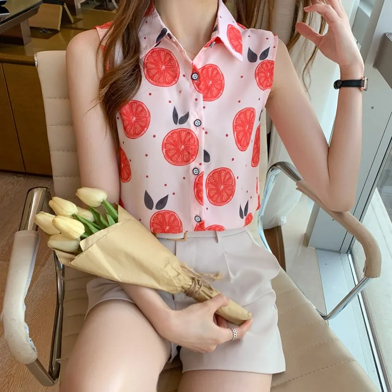 Women summer casual chiffon sleeveless shirts Fruit orange pattern print pink colour Polo-neck loose blouse chiffon tops