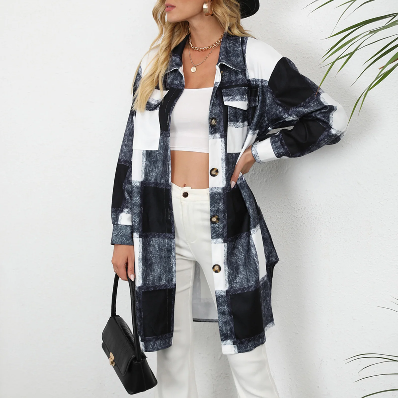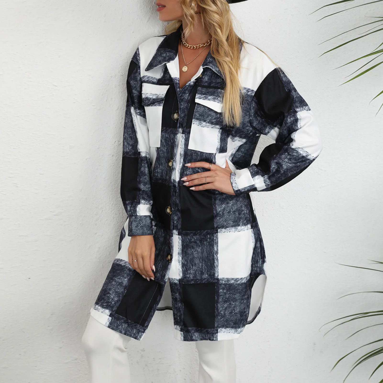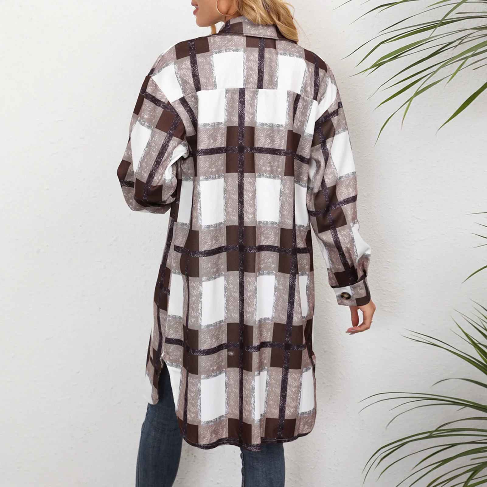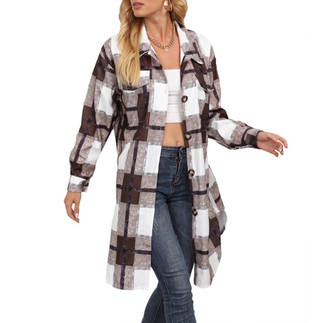Long shirt coat in plaid and striped print for autumn. It has single-breasted front, buttons closure, and turn-down collar. Pair it with skinny pants to complete the chic ensemble.
