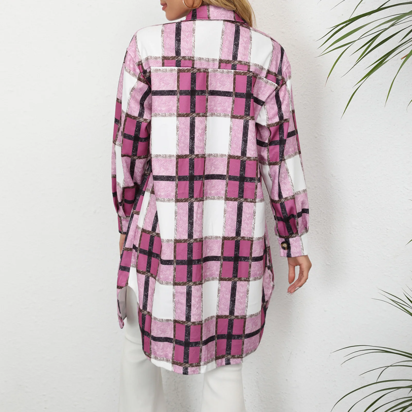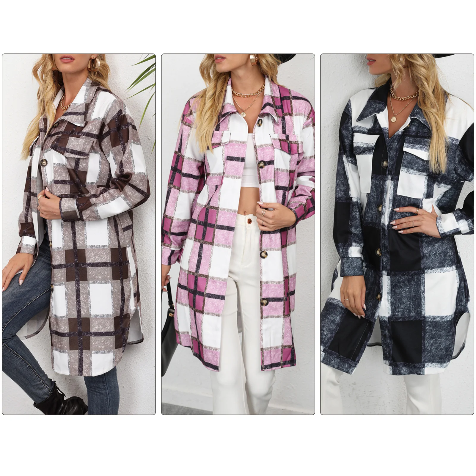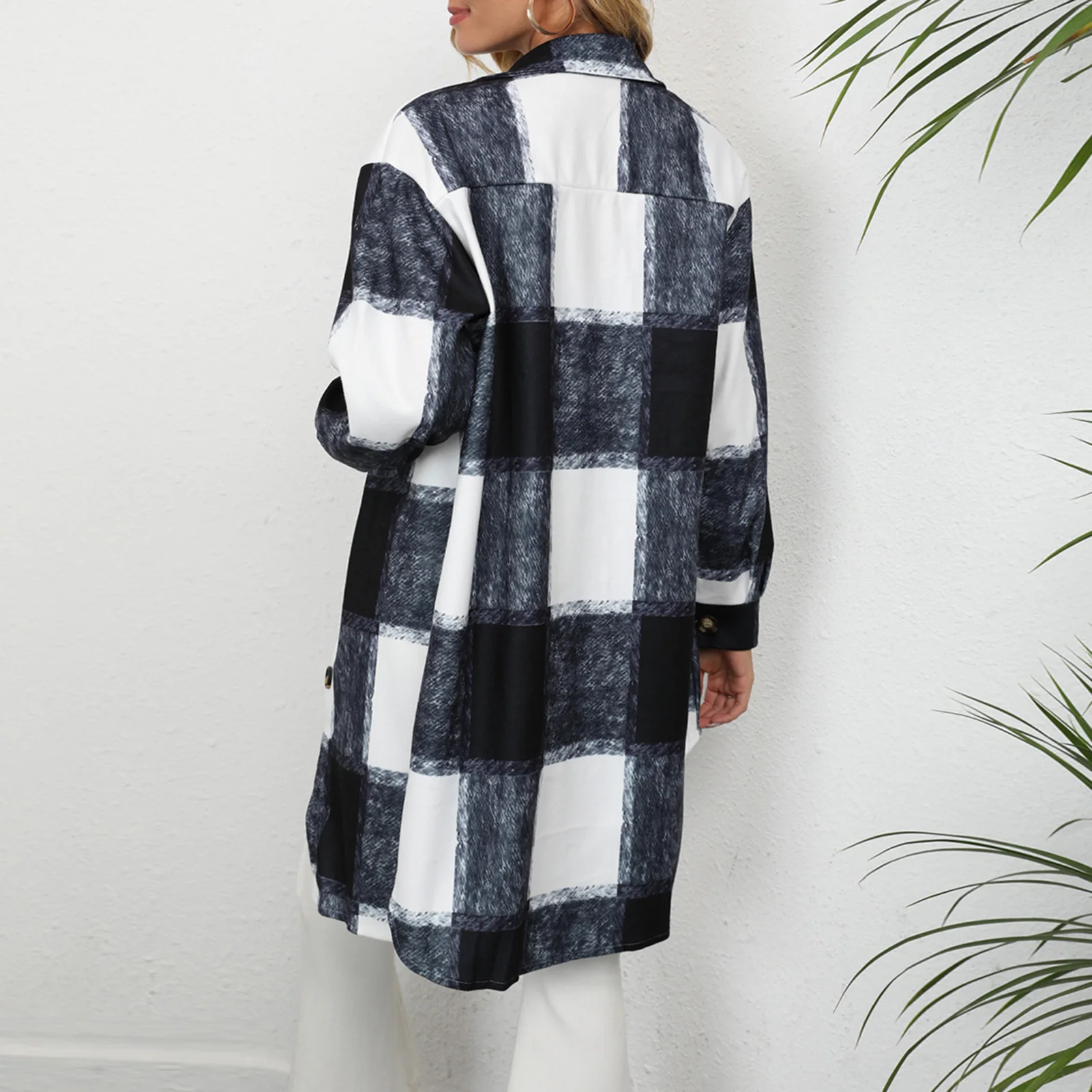 Long shirt coat in plaid and striped print for autumn. It has single-breasted front, buttons closure, and turn-down collar. Pair it with skinny pants to complete the chic ensemble.