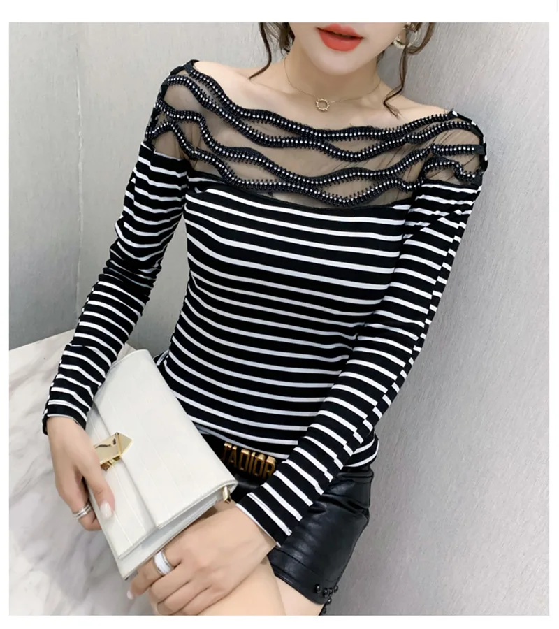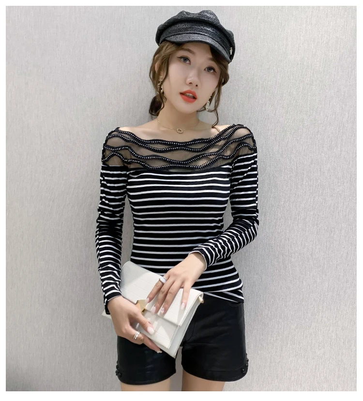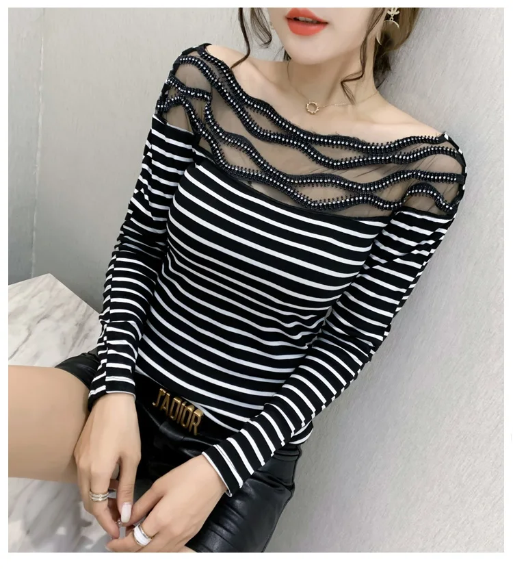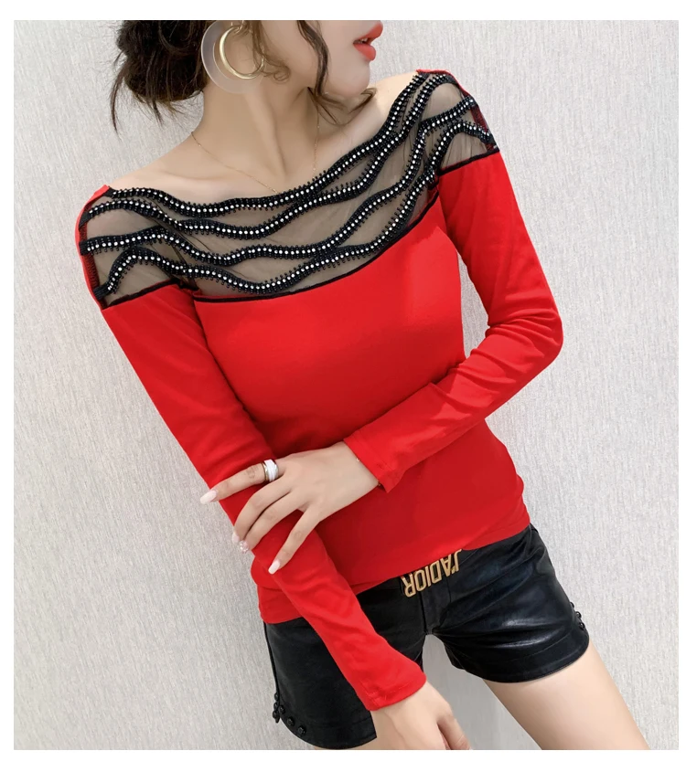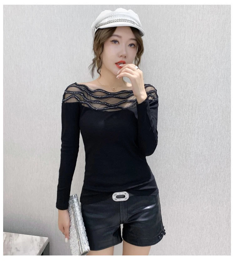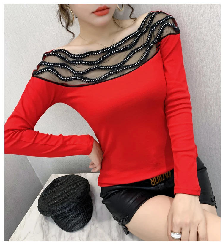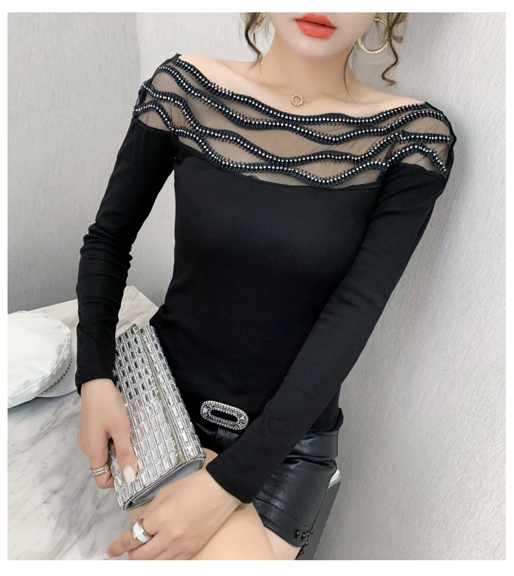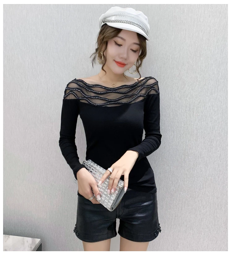 Women's T-shirts New 2021 Autumn long sleeve woman tshirts Sexy Beaded Perspective Plus size tops and shirt blusas