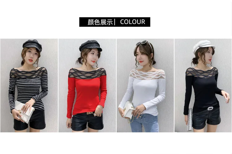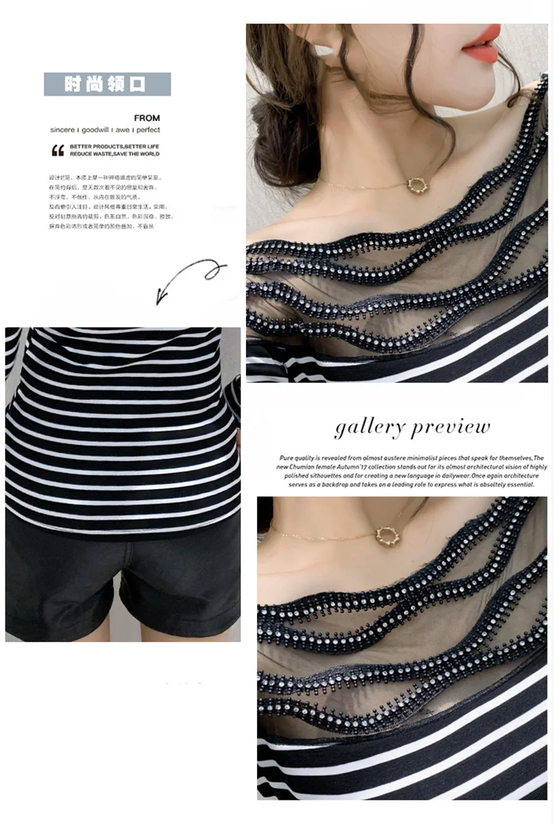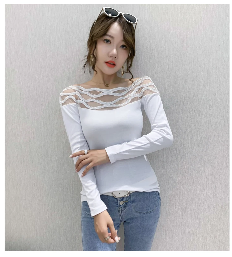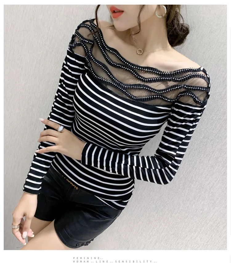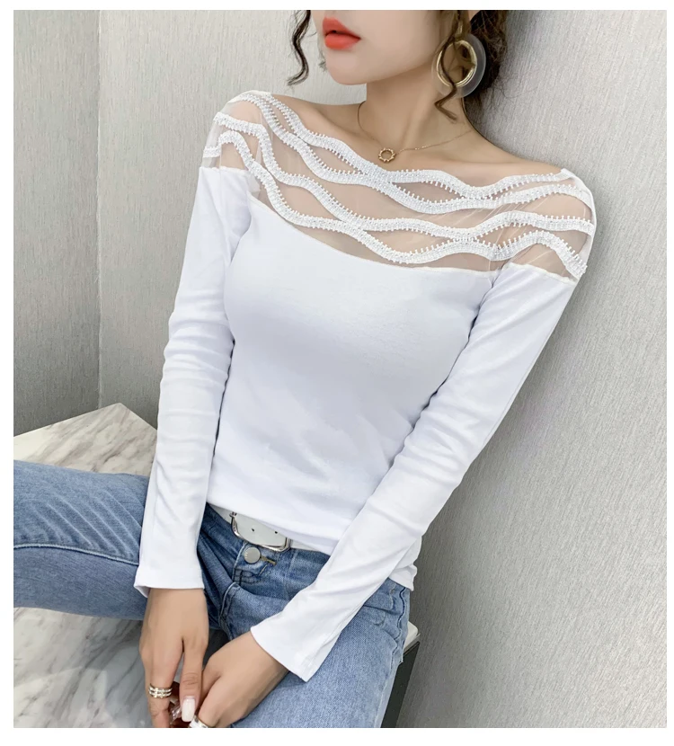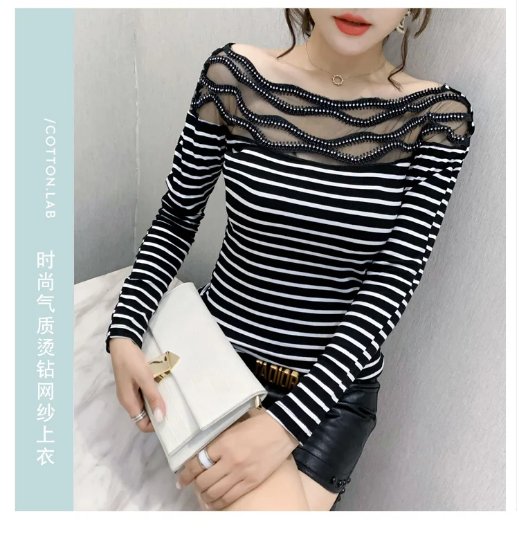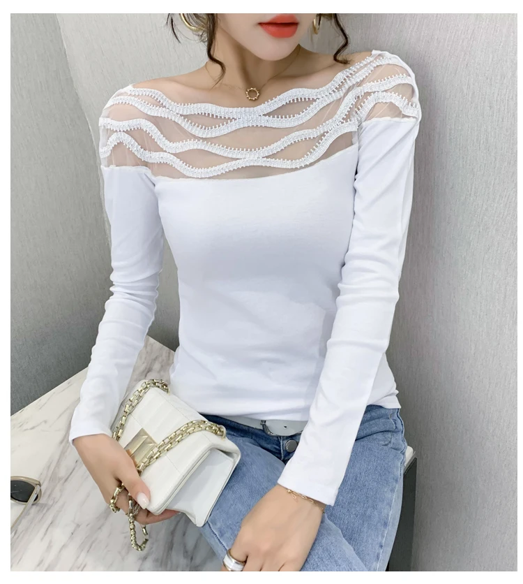 Women's T-shirts New 2021 Autumn long sleeve woman tshirts Sexy Beaded Perspective Plus size tops and shirt blusas
