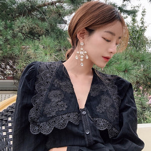 Korean Chic Autumn Vintage Peter Pan Collar Blusa Mujer Lace Stitching Loose Puff Sleeve Blouse Women Elegant Office Lady Shirts