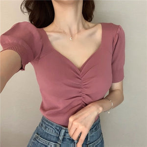 Summer 2022 New All Match Slim Female Tee Sexy V-neck Woman Knitted T-shirts Fashion Puff Short Sleeve Solid Knit Tops Woman
