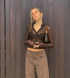 Y2K 2022 Spring Fall Fashion Net Yarn Square Neck Black Long Sleeves Women's Blouses Sexy Tank Cropped Casual Tops Shirts Tee
