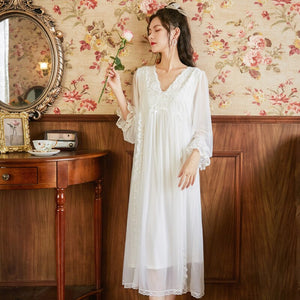 Ladies Vintage Sleepshirts Floral Sleepwear Palace Style Lace Nightgowns V-neck Long white Nightdress Sexy Women Nightwear  - Regular price