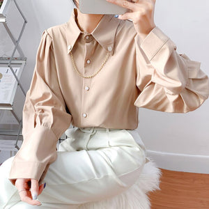 Women Casual Turn-Down Collar Shirts Ladies Spring Autumn Fashion Korean Lantern Long Sleeves Buttons Chain Blouse Streetwear