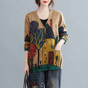 Autumn 2020 Women‘s Knitted Cardigan Vintage Printing V Neck Long Sleeves Pockets Loose Sweater Sweatshirts Casual Mujer Tops