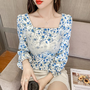 Blouse Women Autumn 2021 New Office Lady Korea French Style Long Sleeve Floral Print Blusas Womens Tops And Blouses