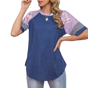 2021 Women Tee Shirts Raglan Short Sleeve Splicing Floral Stripes Print Shirts Loose Fit Tee Tops Casual Summer T-Shirts Femme