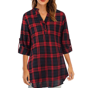 Autumn Winter Casual Fashion Plaid Print Women Shirt Blouses Turn-down Collar Long Sleeves Front Pockets Button Closure Blouses