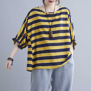 Summer Women Harajuku Striped Tshirt Short Sleeve O-Neck T-Shirts Vintage Cotton Linen Half Sleeve Ruffle Loose Casual Tops