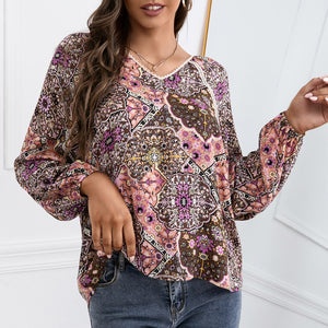 Vintage Print Blouse Women 2021 Autumn Sexy V-Neck Long Sleeve Plus Size Office Elegant Ladies Shirts Casual Tops And Blouses