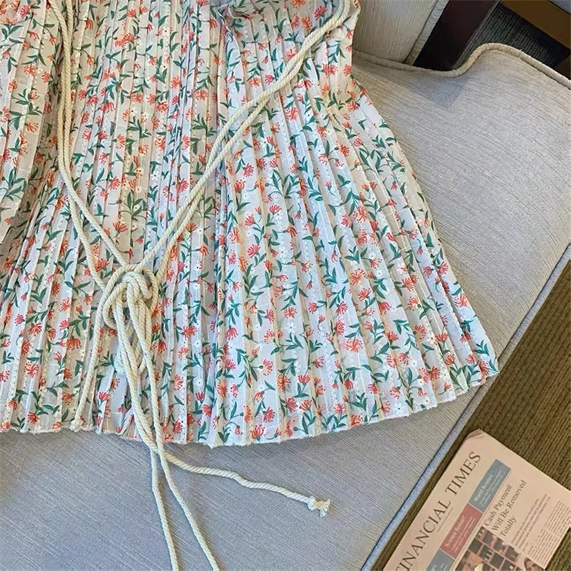 2022 New Women Aesthetic Spaghetti Strap Pleated Dress Flower Print Summer Sexy Korean Fashion Slash Neck Mini Design Ins Street