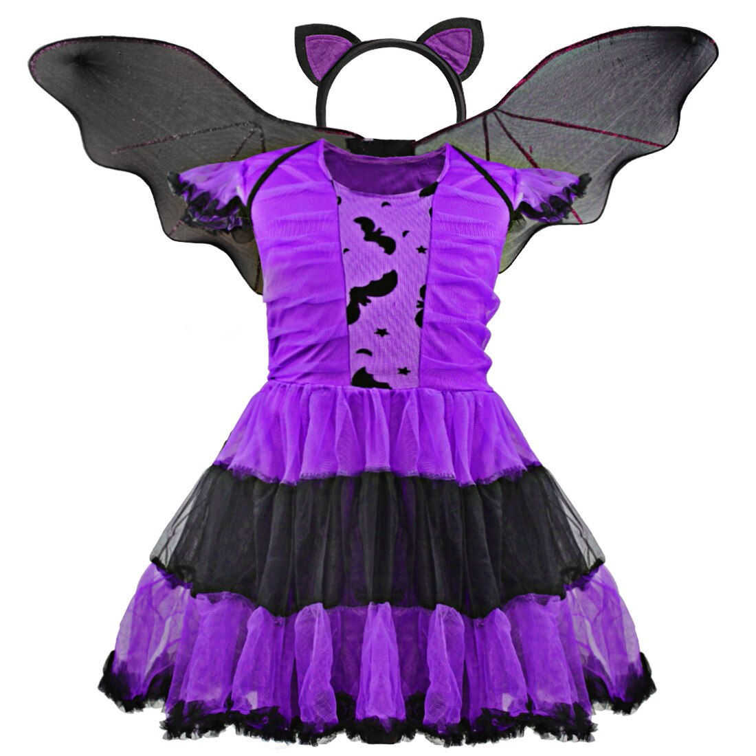 3pcs Girls Halloween Purple Bat Princess Dress Wing Headband Costume Set.