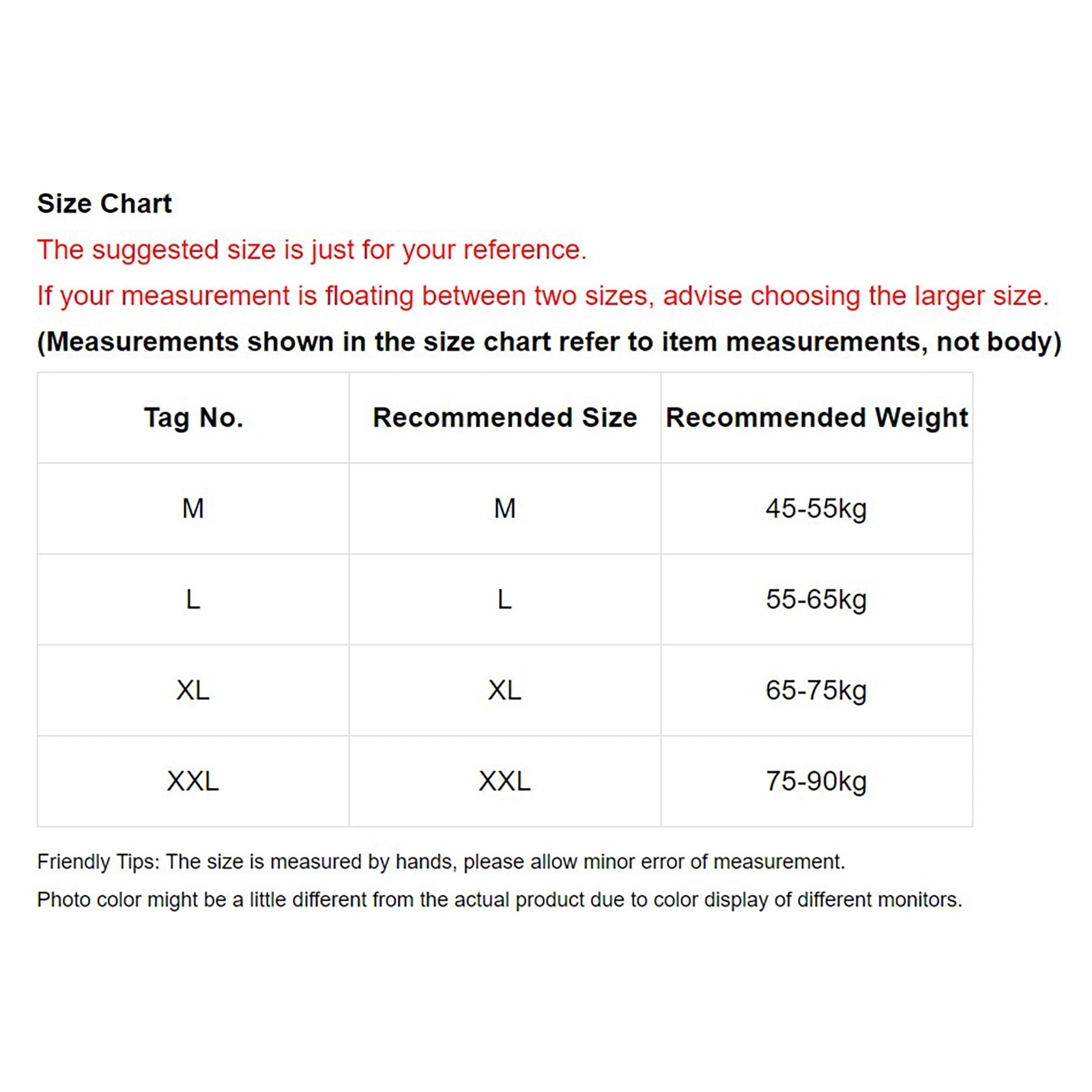 The suggested size is just for your reference. If your measurement is floating between two sizes, advise choosing the larger size.