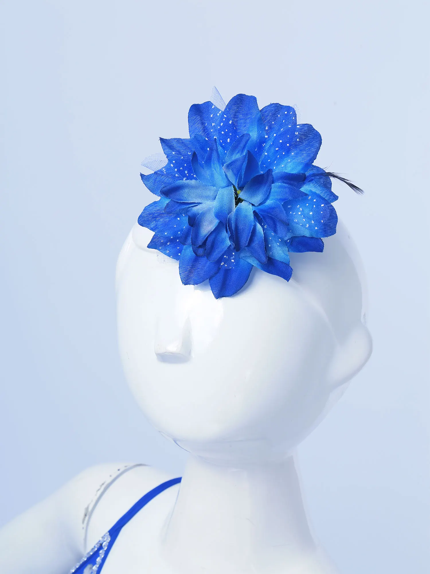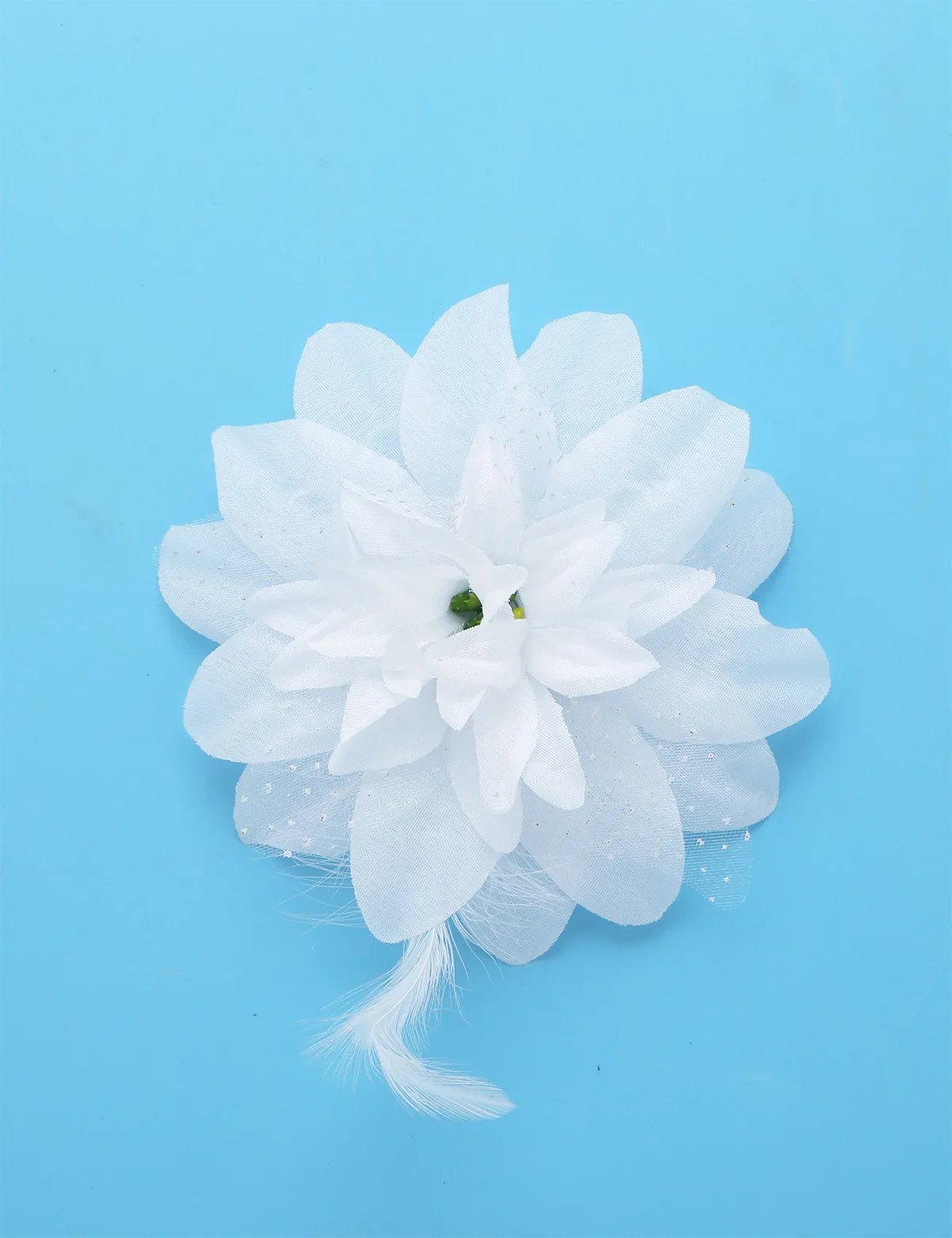 Spaghetti shoulder straps, neckline adorned with silver braided trimming, front with a 3D flower decorated with glittery sequins and beads. Elastic back.