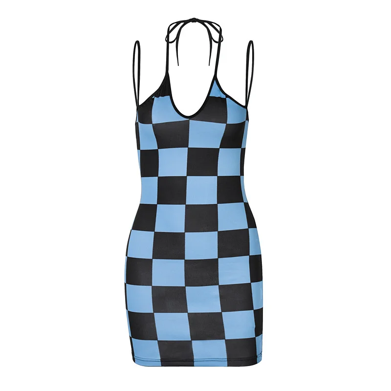 Blue Checkerboard Women Sexy Bodycon Ruched Dress Backless Spaghetti Straps Halter Clubwear Summer Dress Party Dress