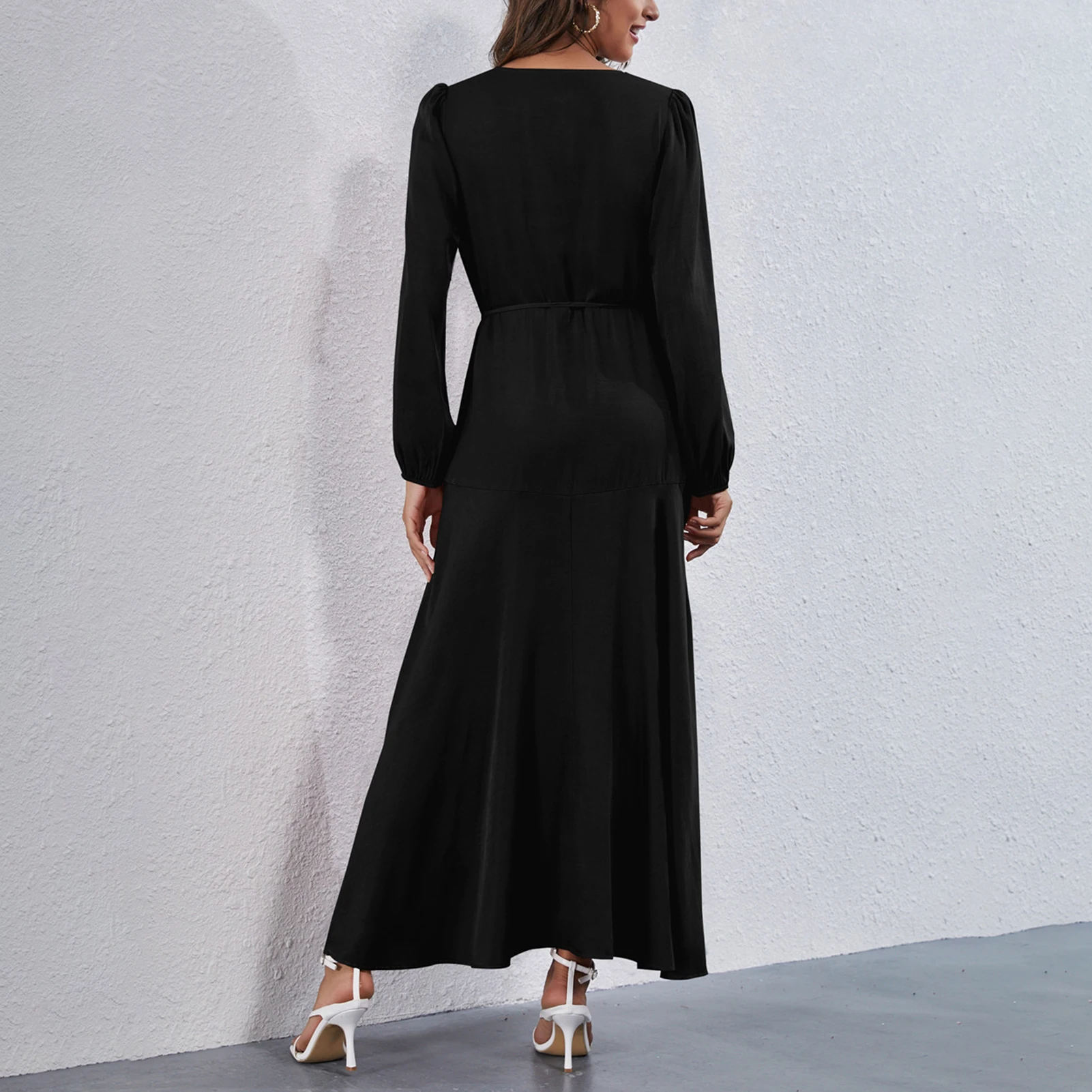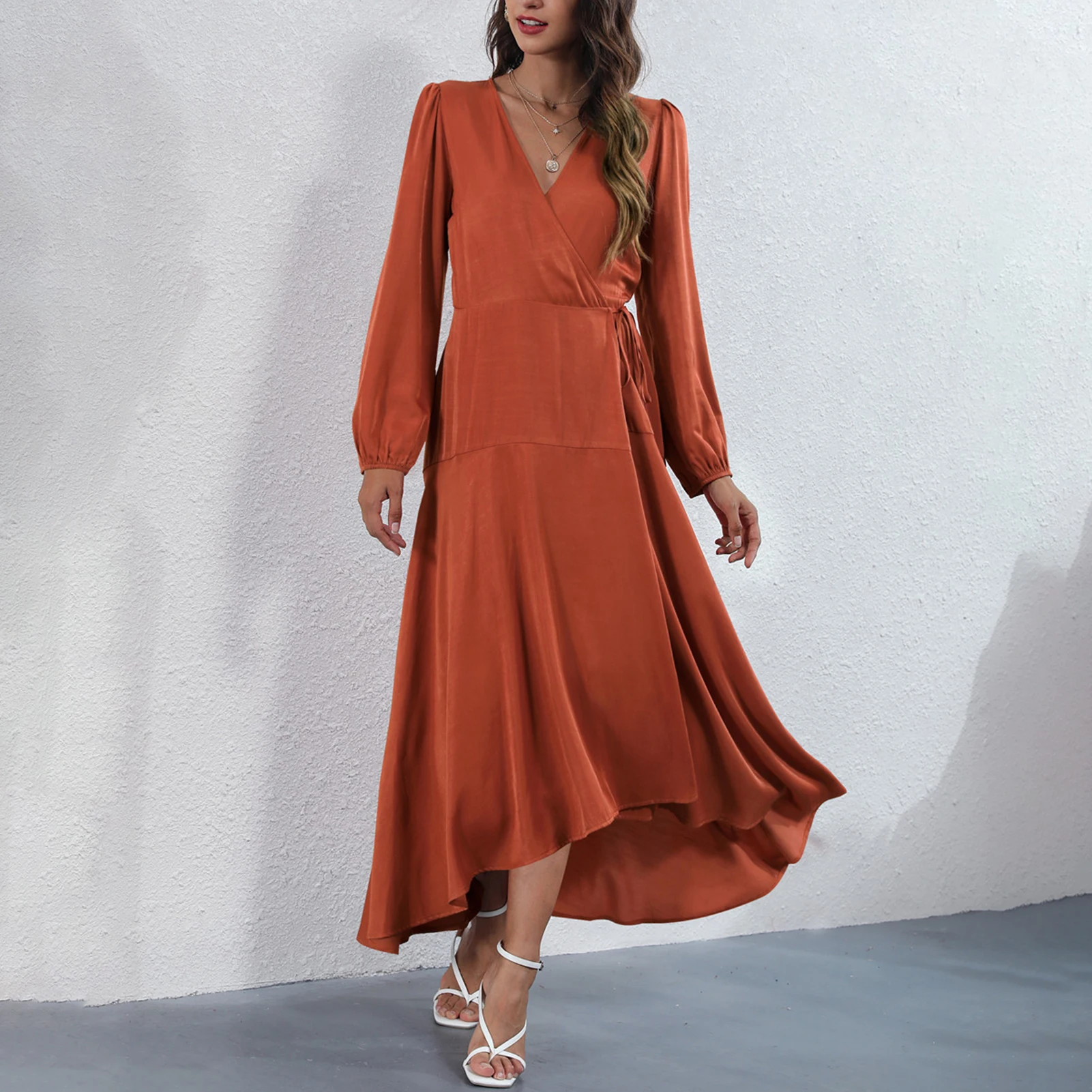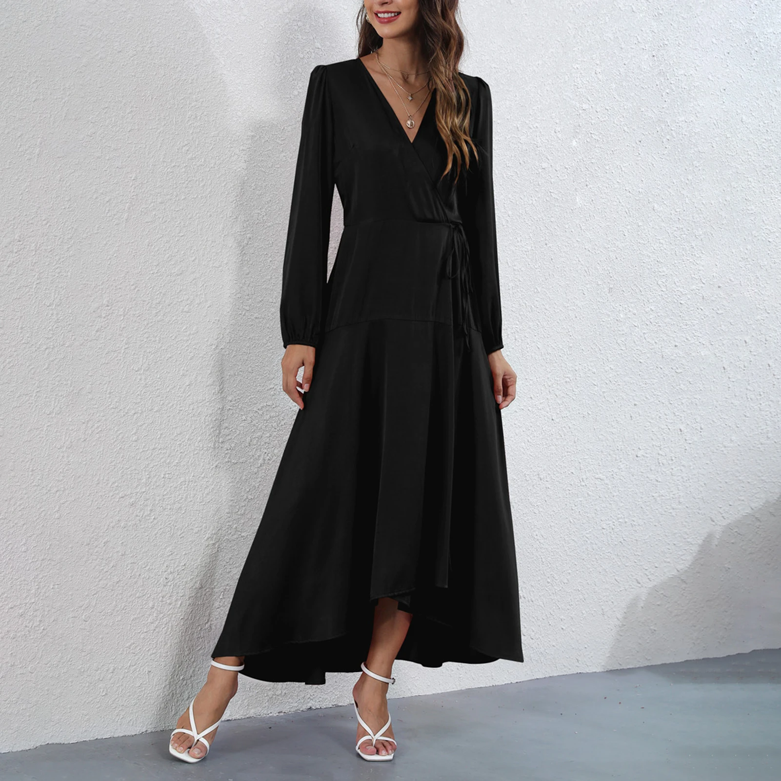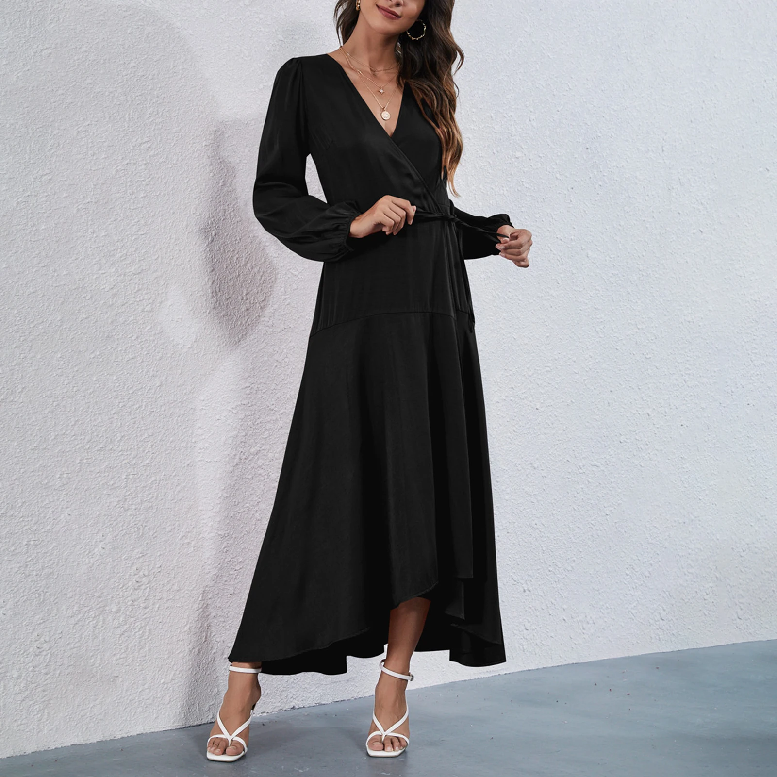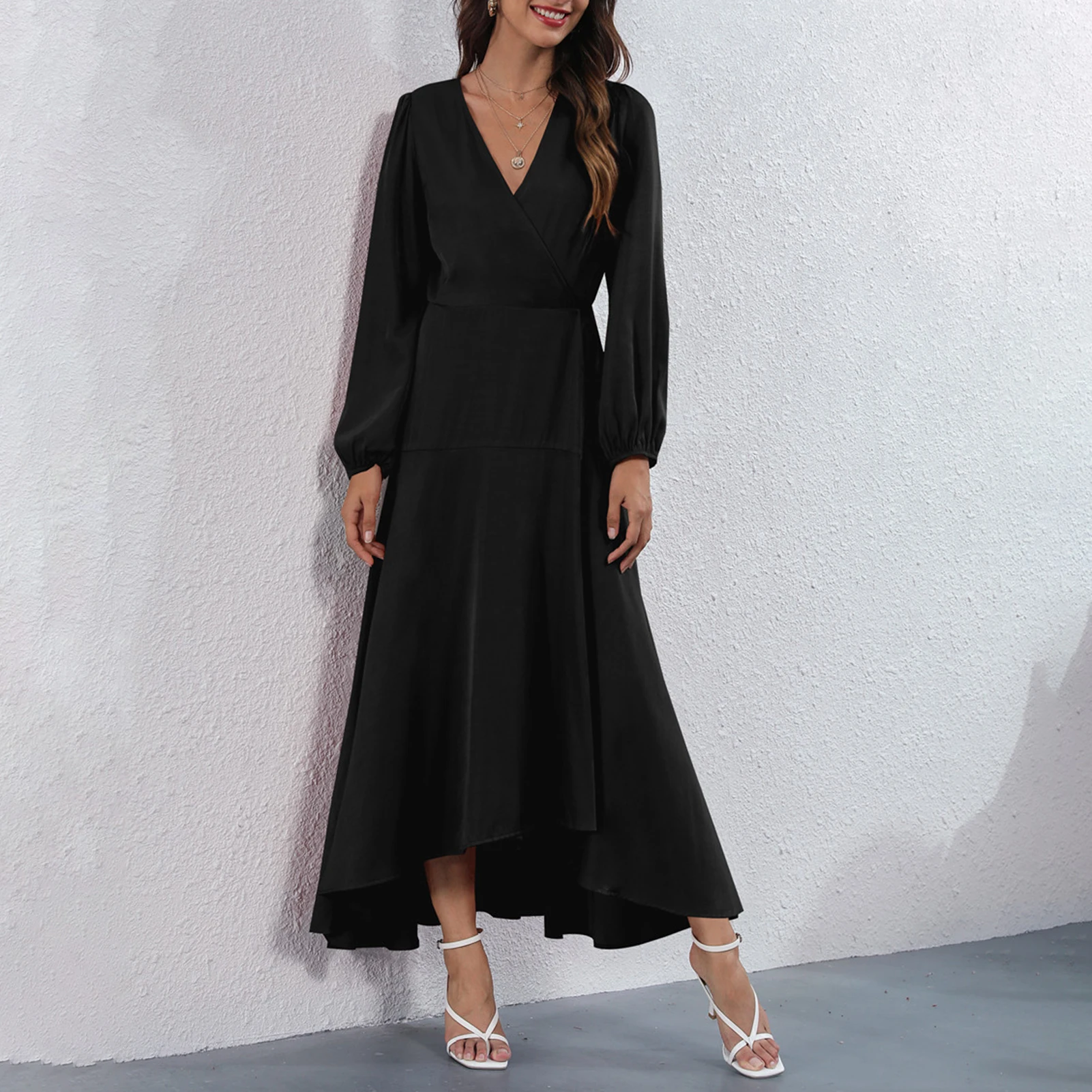 Dress in solid color featuring V neck, long sleeves, high waist and irregular hem is quite elegant and fashion. A nice dress for dinner or party.