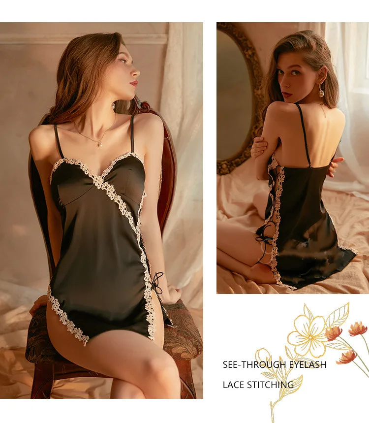 The set includes:Brand autumn and winter hollowed out straps temptation pajamas women deep V chest pad suspenders nightdress home service suit ,(including: nightdress + T pants)