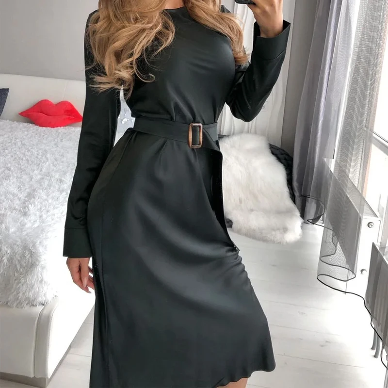 Casual Satin Women's Dress Sexy Slim O Neck Long Sleeve Belt Dress Autumn New Fashion Elegant Solid Color Party Night Midi Dress