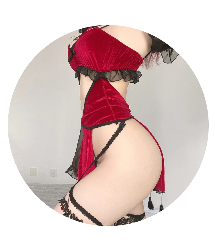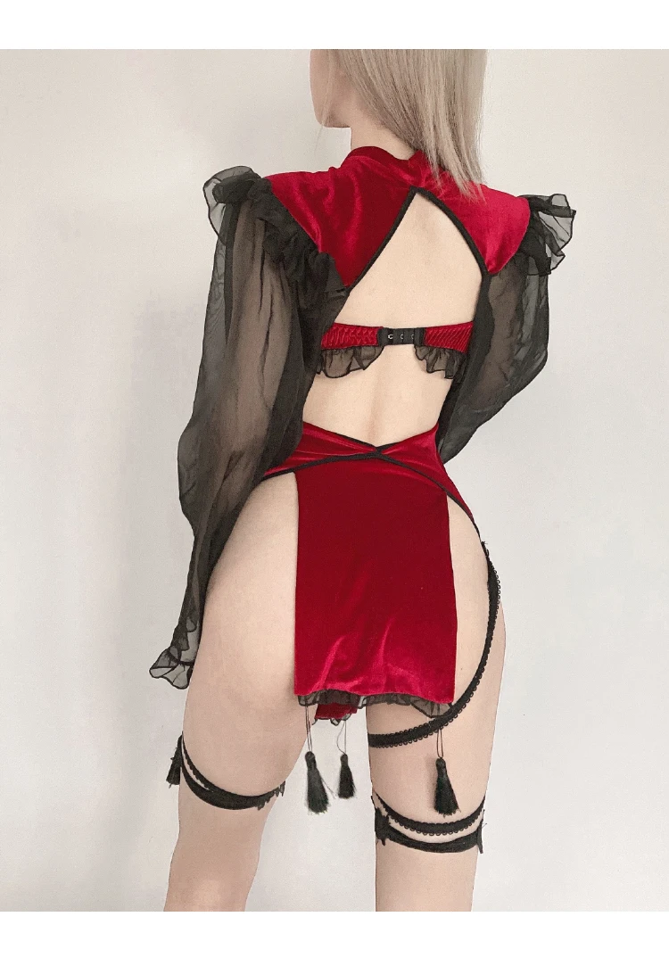 Dark Witch Hollow Mesh Sleeve Cheongsam Dress Bandage Halloween Uniform Sexy Lingerie Devil Cosplay Costumes Live Show Outfits