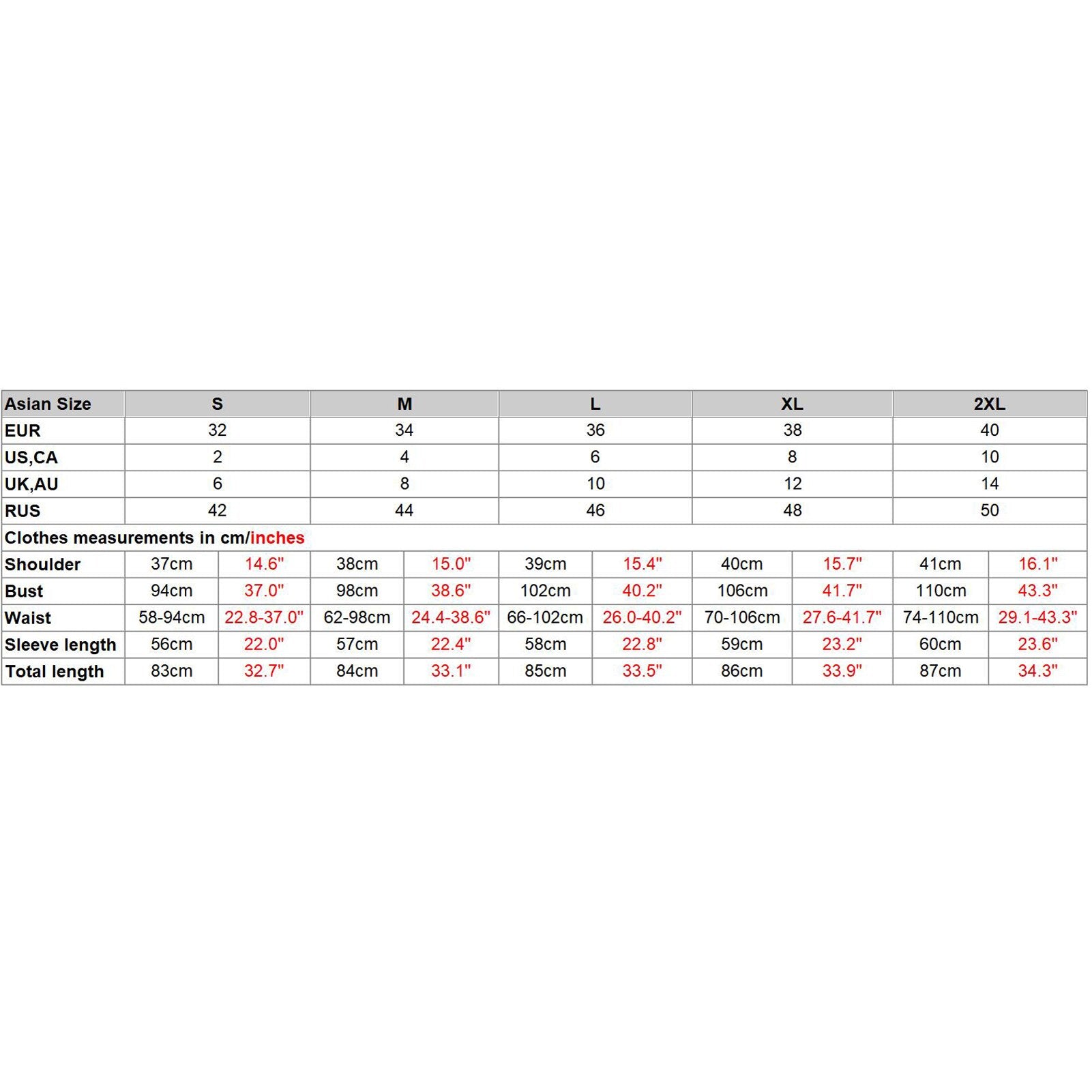 1.This clothing size information is just for reference only, please check the above detailed measurement to choose the correct size, and allow 1-2cm (0.4-0.8") differences due to manual measurement, thanks.