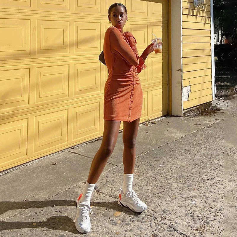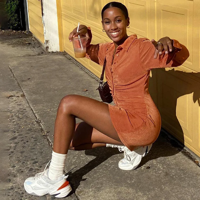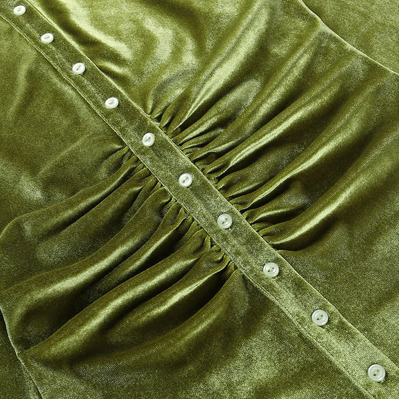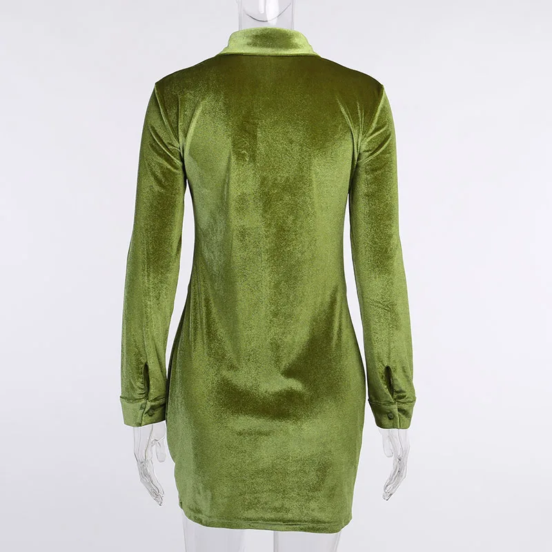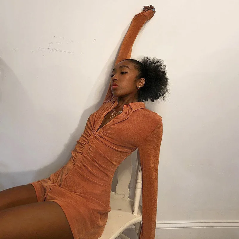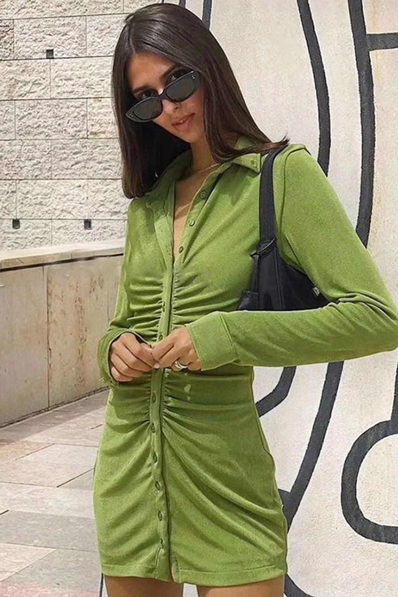 Fall 2021 Pleated Long-Sleeved Solid Color Tight Dress Women's Lapel Sexy Elegant Mini Skirt Women's Button Slim Party