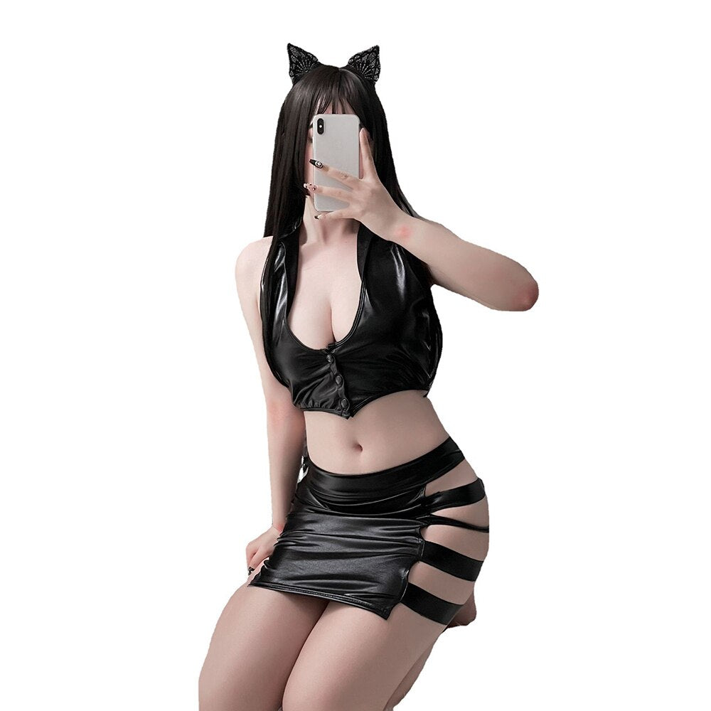 Female Erotic Latex Leather Uniform Teacher Secretary Cosplay Office Hollow Out Role Play Sexy Lingerie Uniform Nightwear Dress