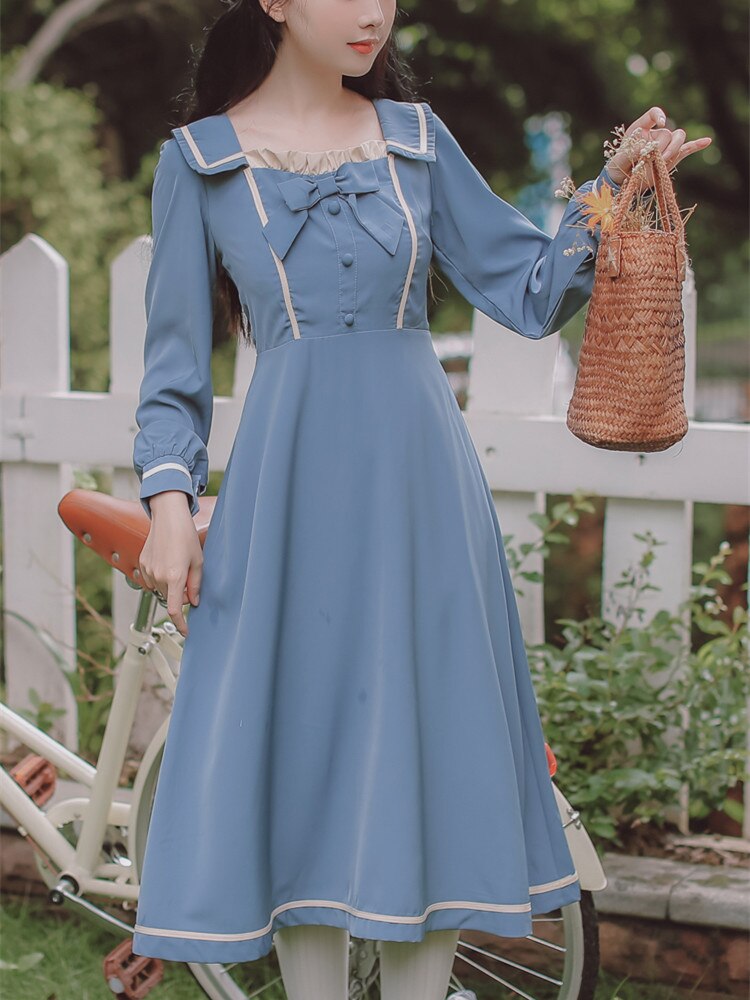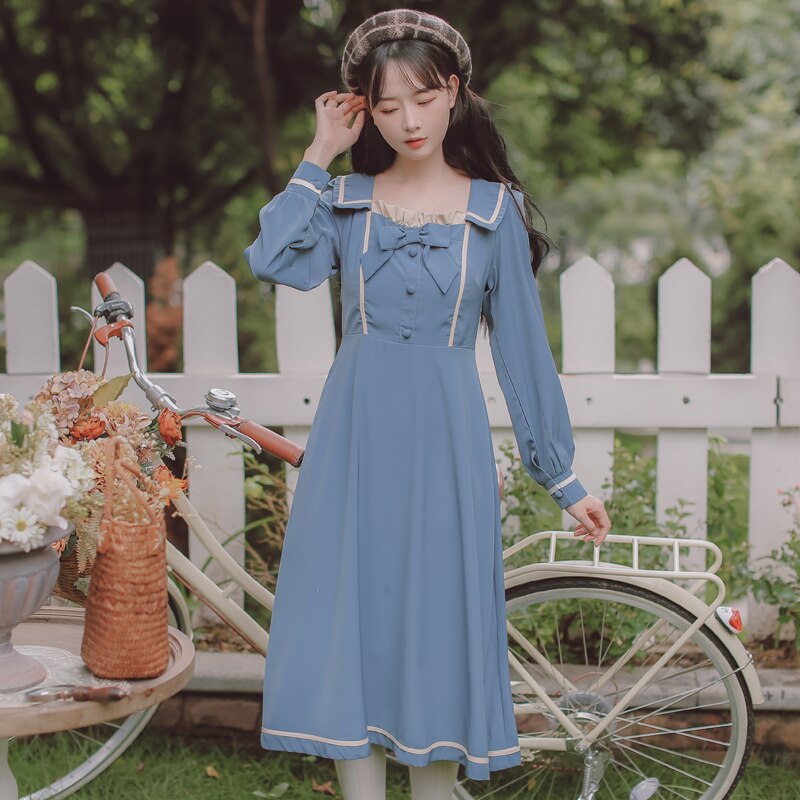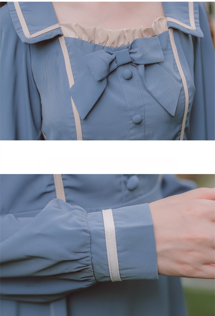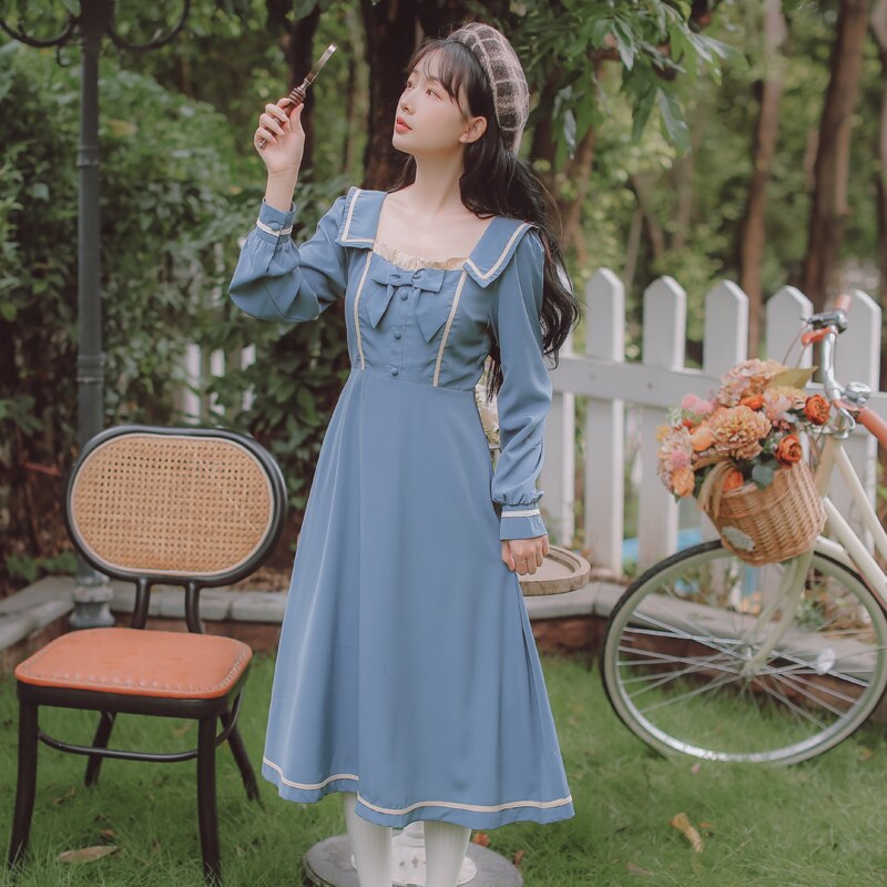 French Elegant Blue Dress Female Fall Robe Femme Lotus Leaf Stitching Retro Square Collar Dress Lady Bow Cute Party Dress Fairy