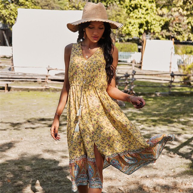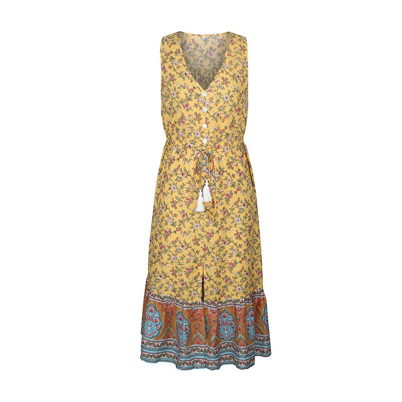 Holiday Style Sleeveless Print Dress Women Casual High Waist V Neck Tassel Spring Summer Dress For Women New