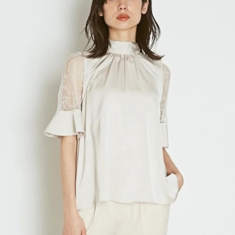 Sweet Lace Patchwork Temperament Lace Up Bow Blusas Mujer Half Sleeve Women Blouses Elegant Stand Collar Women Solid Tops