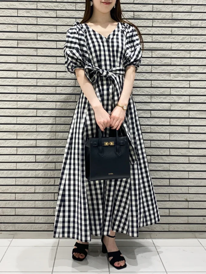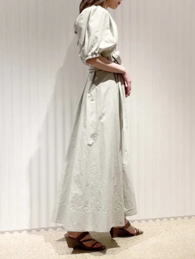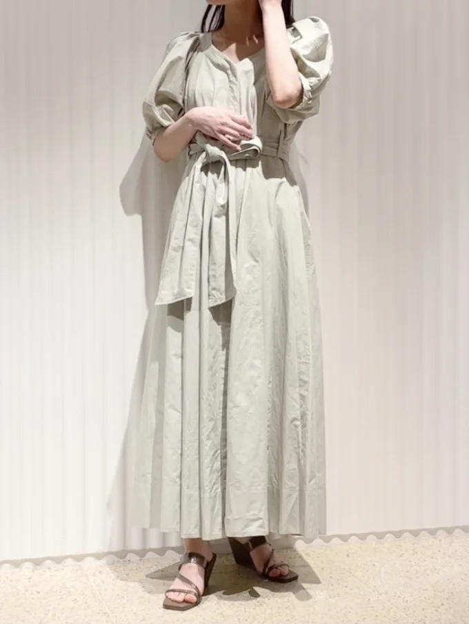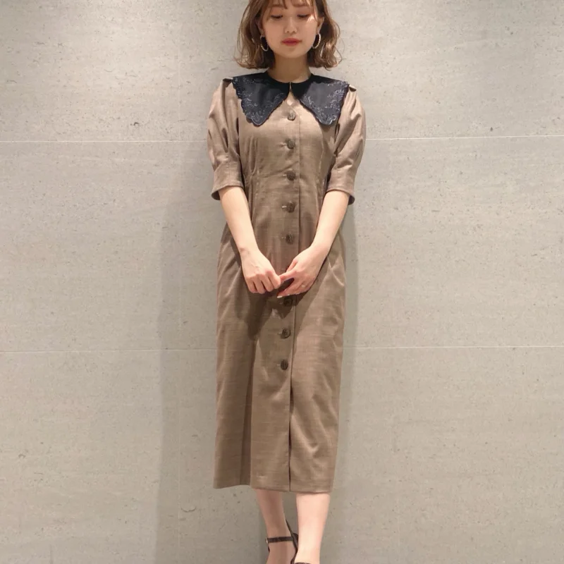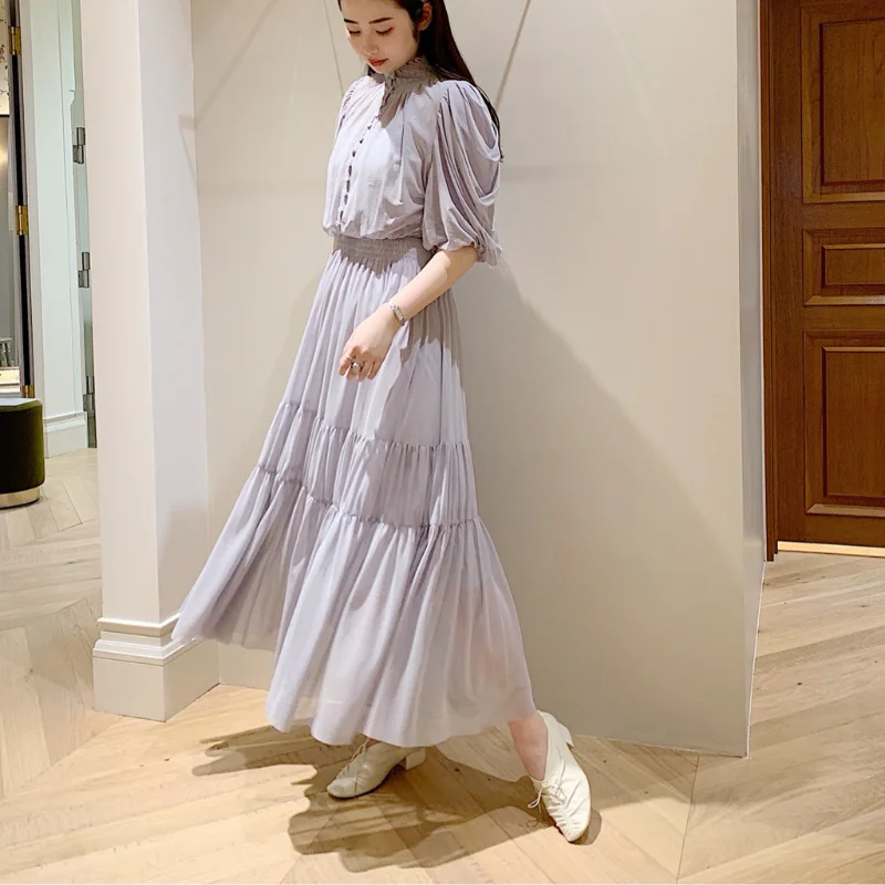 Chic Button Design Women Dresses Stand Collar Puff Sleeve Pleated Dress Spring Japan Style Sweet Office Lady Slim Waist Robe