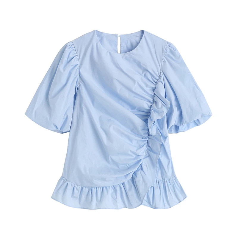 French Style Ruffles O Neck Women's Shirt Folds Puff Sleeve Slim Waist Summer 2021 T-shirts Solid Simple Casual Woman T Shirts