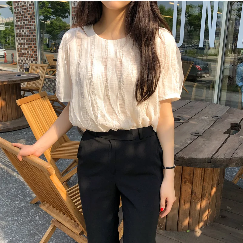 Summer New Design Puff Sleeve Retro Shirt Korean Style Chic Short Sleeve Shirt for Women Simple Solid All Match Blusas De Mujer