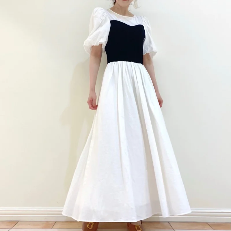 Summer Elegant Puff Sleeve Knit Patchwork Woman Dress 2021 High Waist Silm Vestidos New Fashion Office Lady All Match Robe