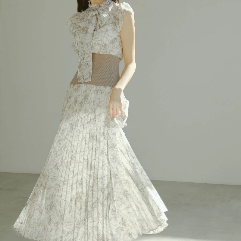 Japan Style High Waist Women Dress Pleated Slim Waist Spring Summer Dresses New Sexy Hollow Out Chic Print Elegant Vestidos