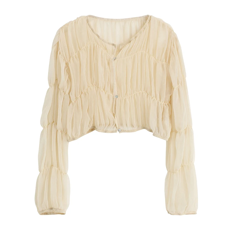 Simple Solid Shirring Long Sleeve V Neck Short Women's Blouse All Match Rash Guards Femme Tops Spring Summer Soft Women Shirts