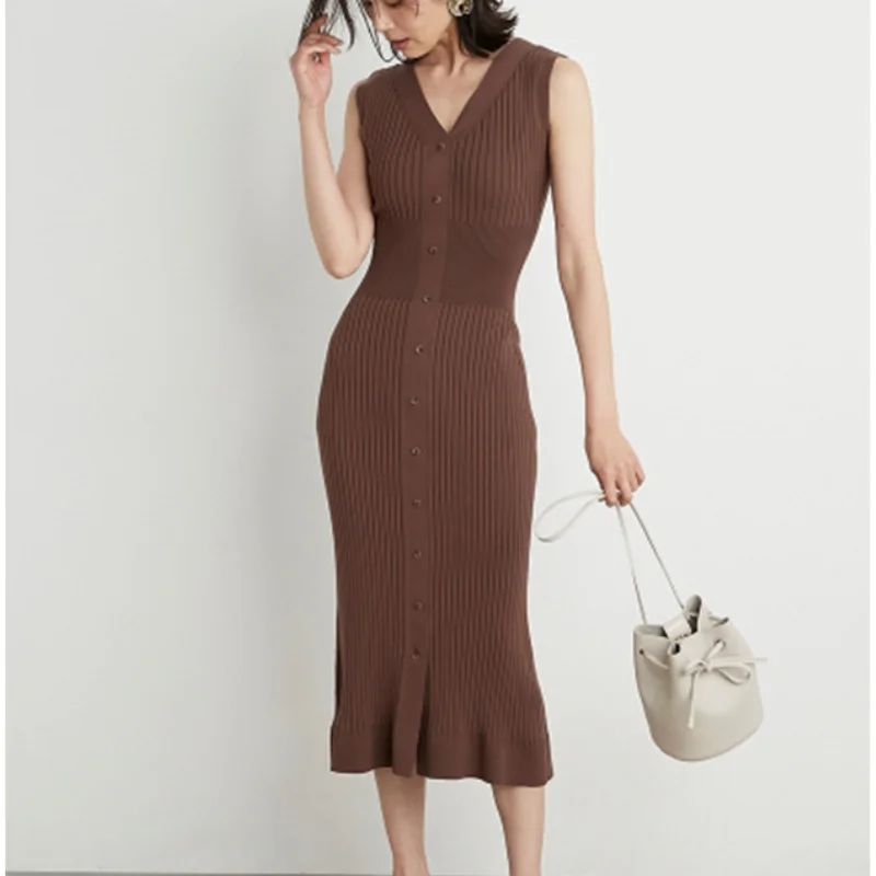 Solid V-neck Single Breasted Sleeveless Trumpet Knit Dress Simple Slim Fit Bodycon Sexy Femme Robe Elegant All Match Vestidos