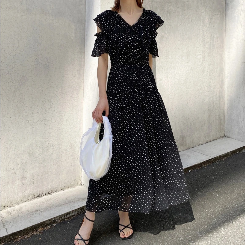 Sweet Polka Print V-neck Ruffle Hollow Out Chiffon Dress Simple Japan Style Slim Waist Femme Robe Elegant Trendy Summer Vestido