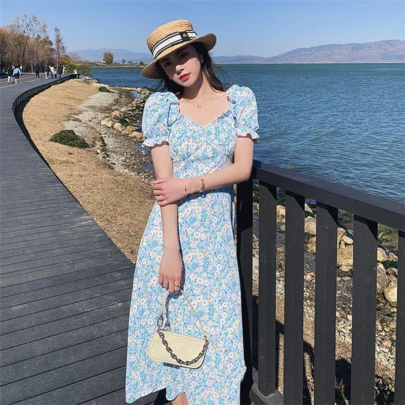 2021 Summer Flying Sleeve Print A Line Slim Waist Vestidos Japan Style Elegant Temperament Sweet Dress Simple Moda Femme Faldas