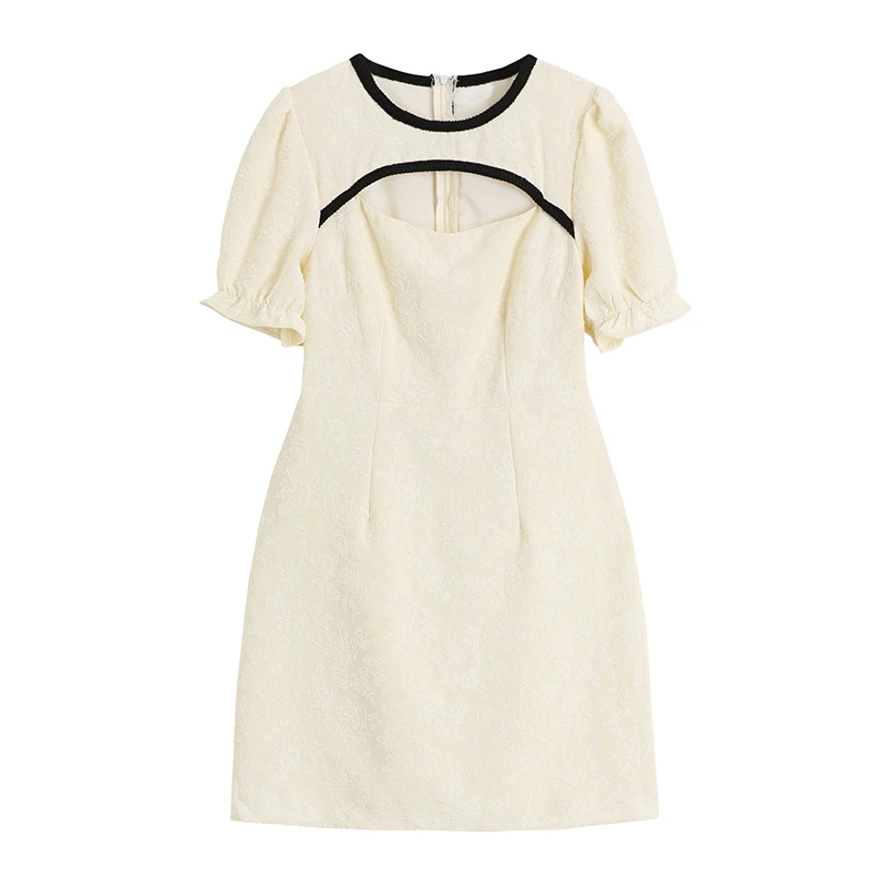 Retro Sweet Jacquard Dress Women Summer Fashion Hollow Out O Neck Vestidos Slim Waist A-line Bodycon Simple Design Femme Robe