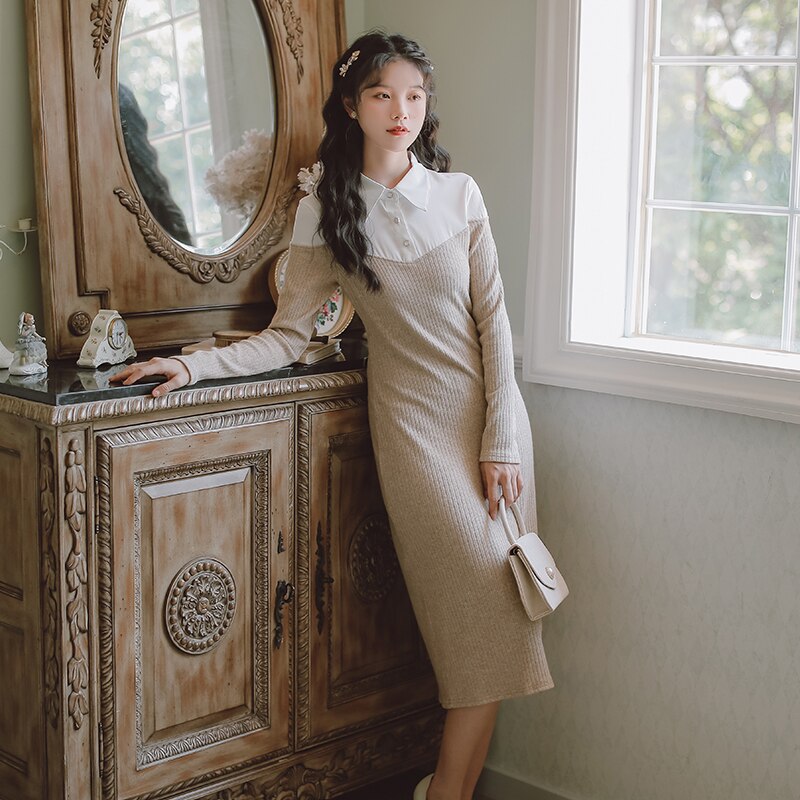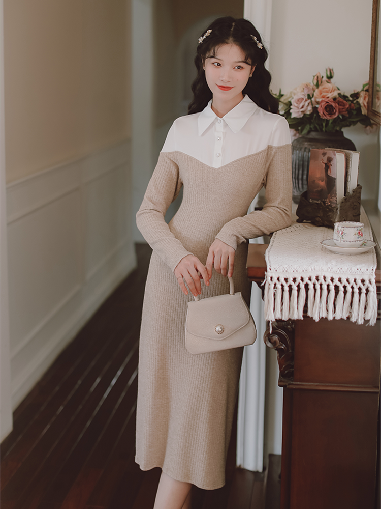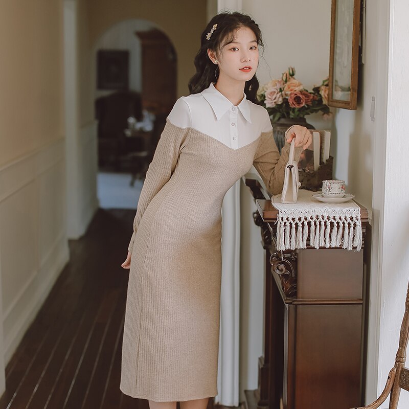Knitted Dress Slim Sexy Simple Fashion Bodycon Dress Women's Autumn Lapel Stitching Beaded Chic Retro Sweater Dress Fall Femme
