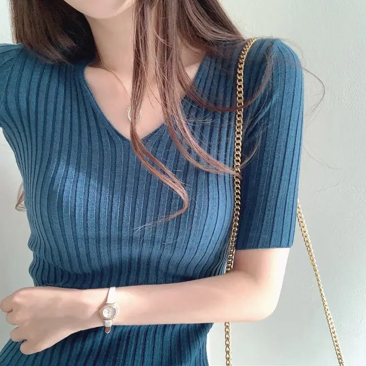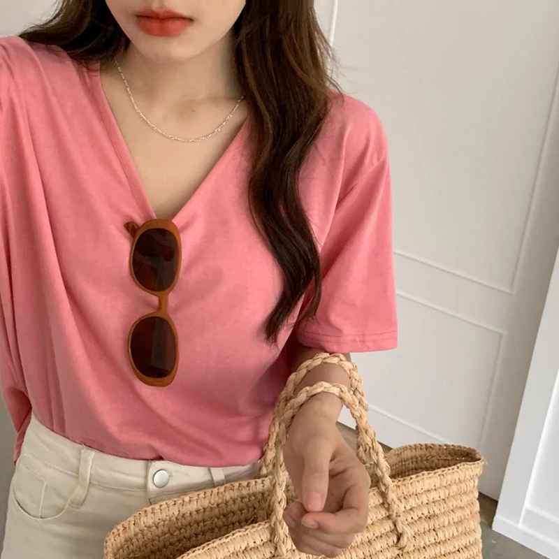 Korean Chic Summer Simple V Neck Short Sleeve Tshirt Women Loose Casual All Match Women Tops Basic Tees Hipster Soft Y2k Verano