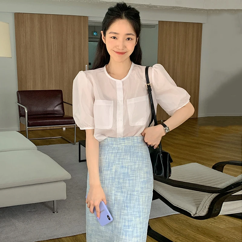 Korean Chic O Neck Slightly Transparent Shirts Women Simple Loose Puff Sleeve Office Ladies Basic White Blouse Elegant Moda Tops