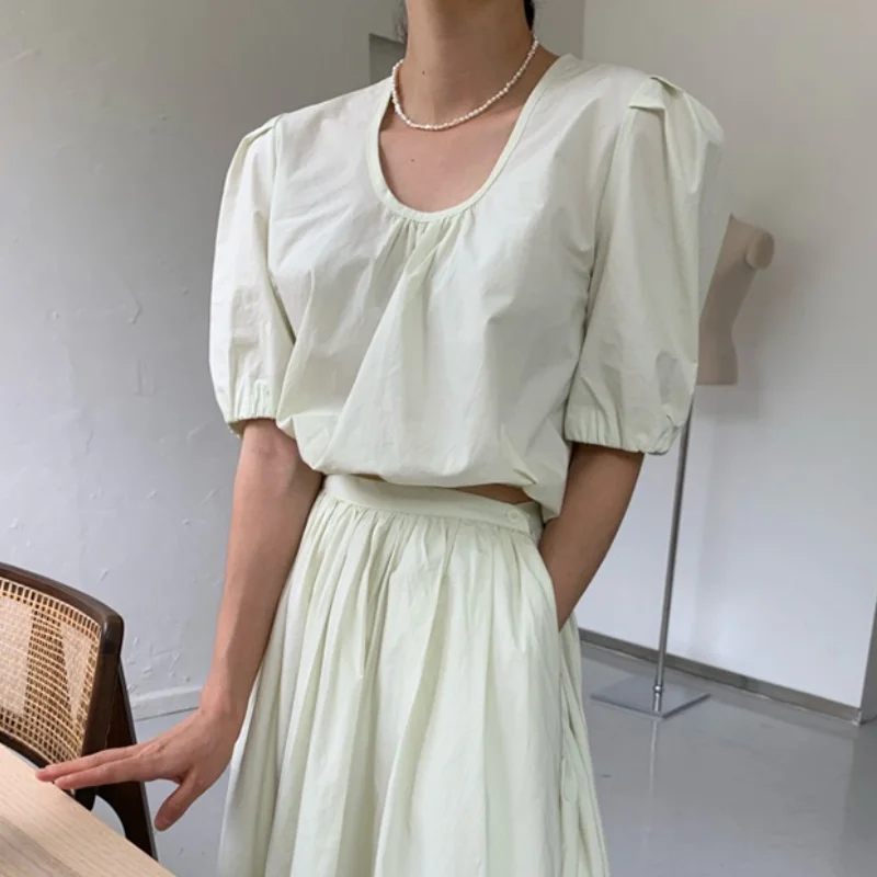 Korean Chic Temperament U-neck Back Button Shirts Women Office Ladies Loose Puff Sleeve Women Blouse Elegant Summer 2021 Blusas